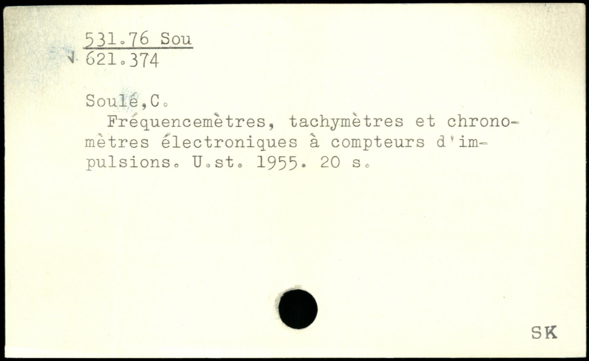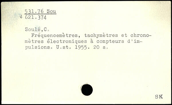 Soûlé,C , Fréquencemètres, tachymètres et chronomètres électroniques à compteurs d'impulsions.. UoSto 1955.