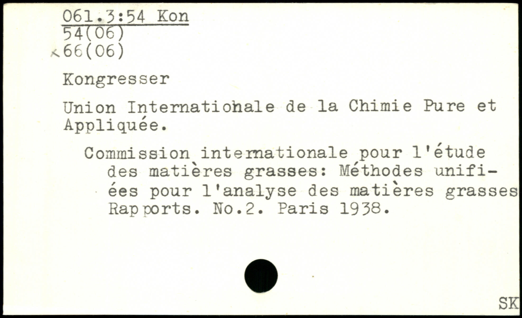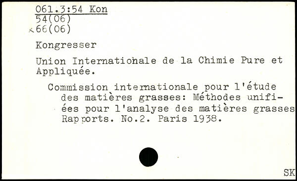 Union Internationale de la Chimie Pure et Appliquée. Commission internationale pour l'étude des matières grasses: Méthodes unifiées pour l'analyse des matières grasses Rapports. No. 2.