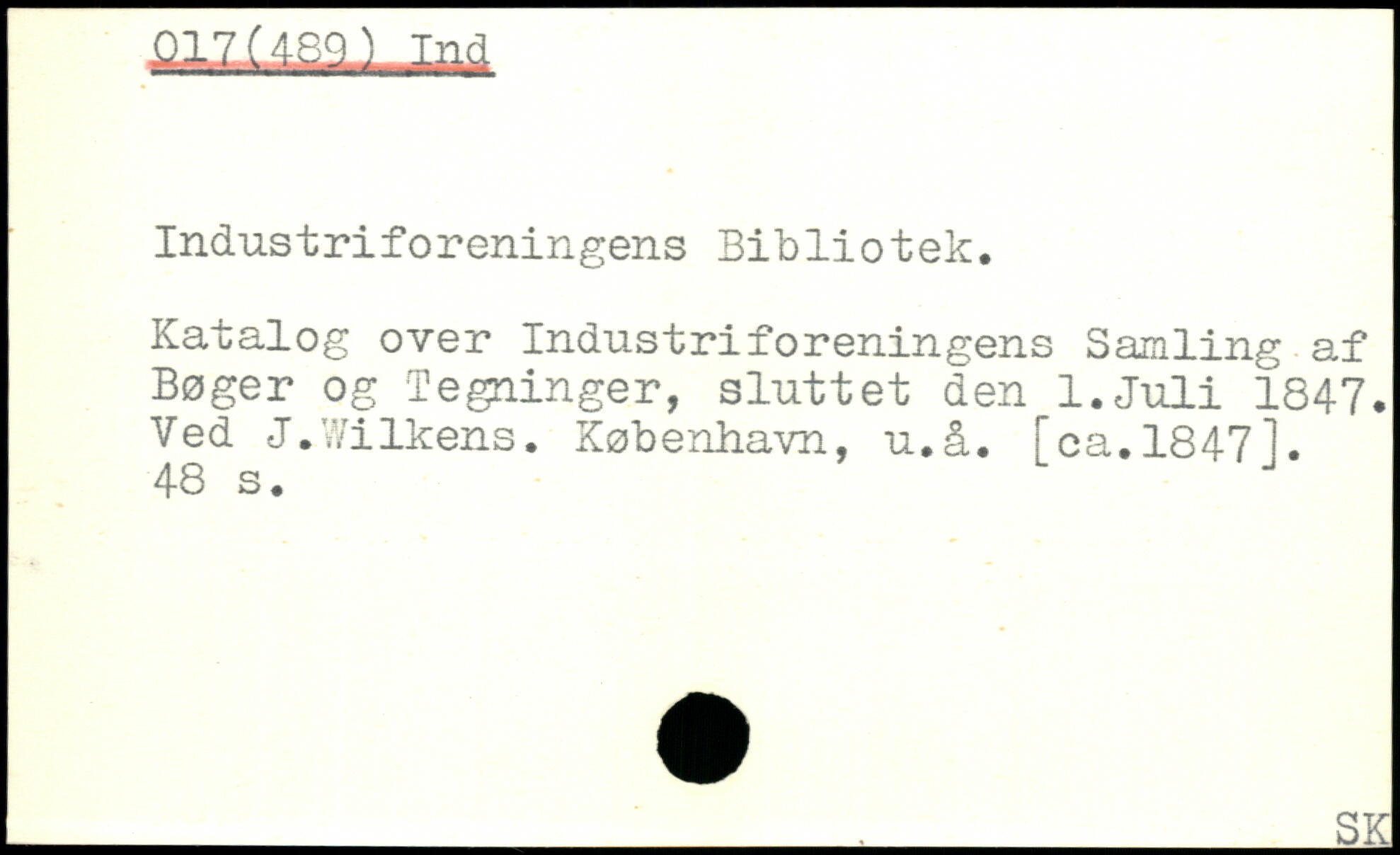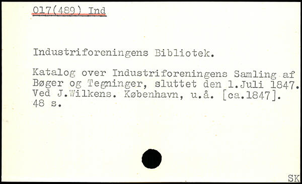 Industriforeningens Bibliotek. Katalog over Industriforeningens Samling af Bøger og Tegninger, sluttet den l.Juli 1847. Ved J.Wilkens. København, u.å. Fca.18471.