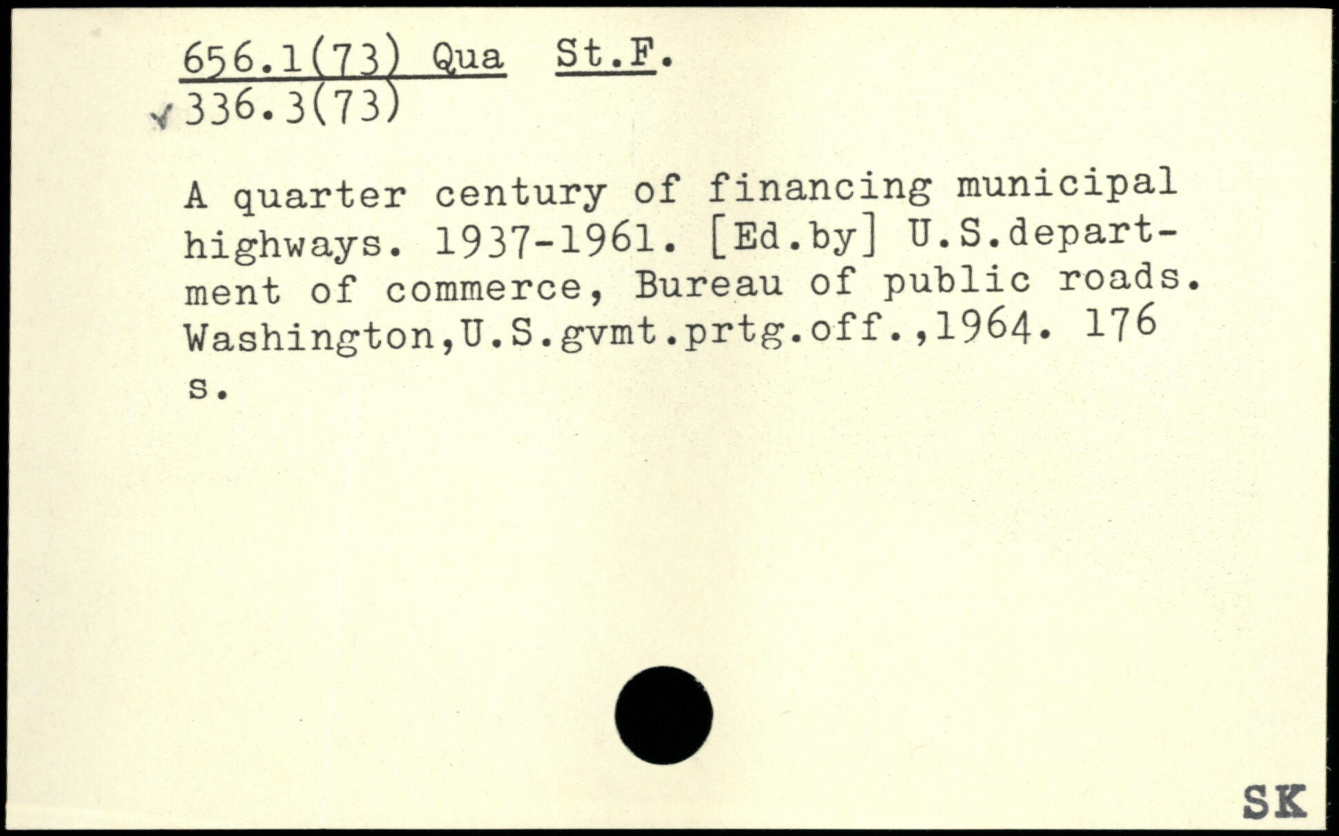 A quarter century of financing municipal highways. 1937-1961. [Ed.by] U.S.department of commerce, Bureau of public roads. Washington,U.S.gvmt.prtg.off.,1964.