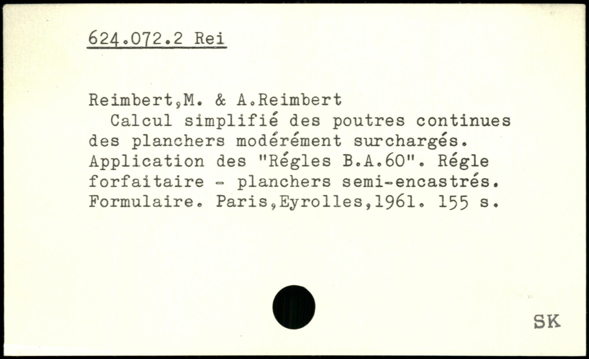 Calcul simplifié des poutres continues des planchers modérément surchargés. Application des "Régies B.A.60". Régie forfaitaire - planchers semi-encastrés. Formulaire. ParissEyrolles,1961.