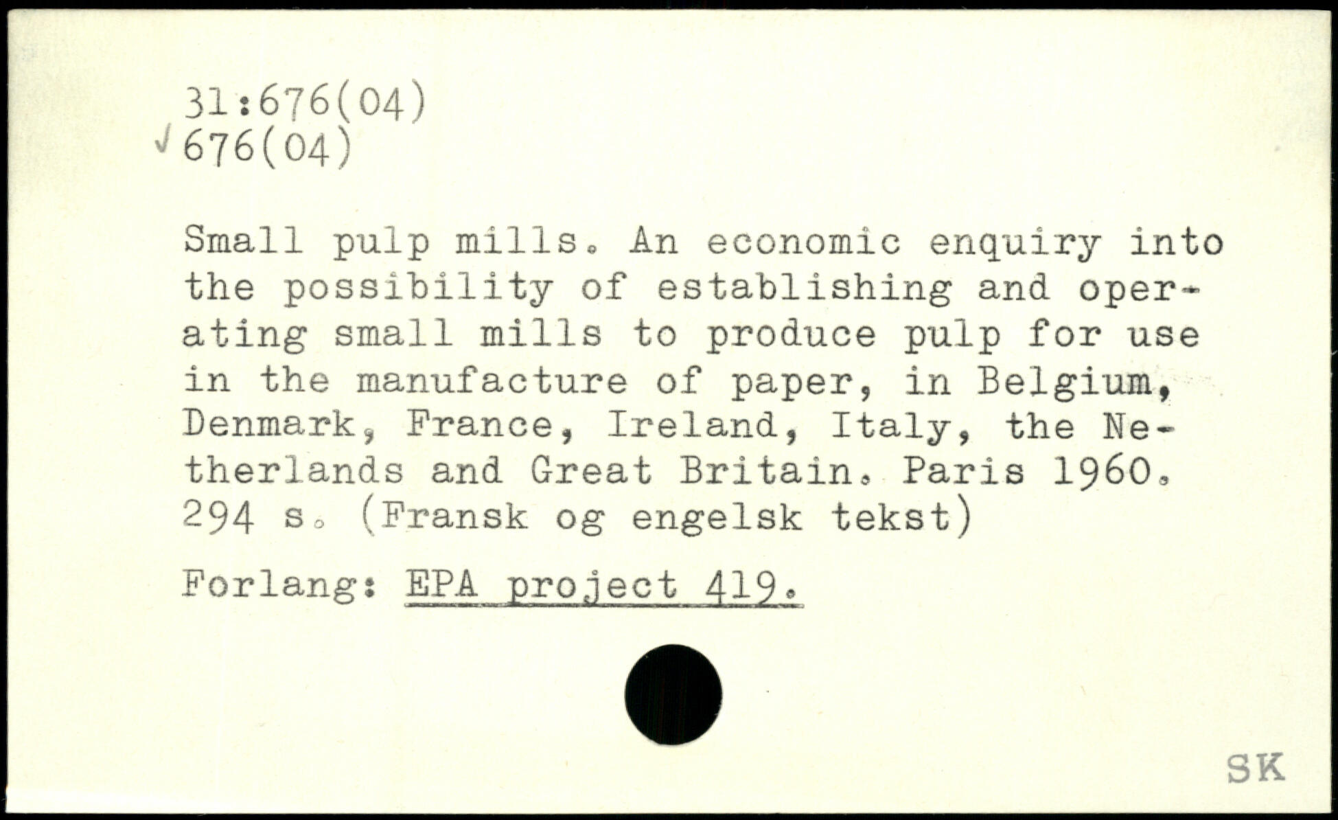 Small pulp mills. An economic enquiry into the possibility of establishing and oper-ating small mills to produce pulp for use in the manufacture of paper, in Belgium, Denmark, Prance, Ireland, Italy, the Netherlands and Great Britain