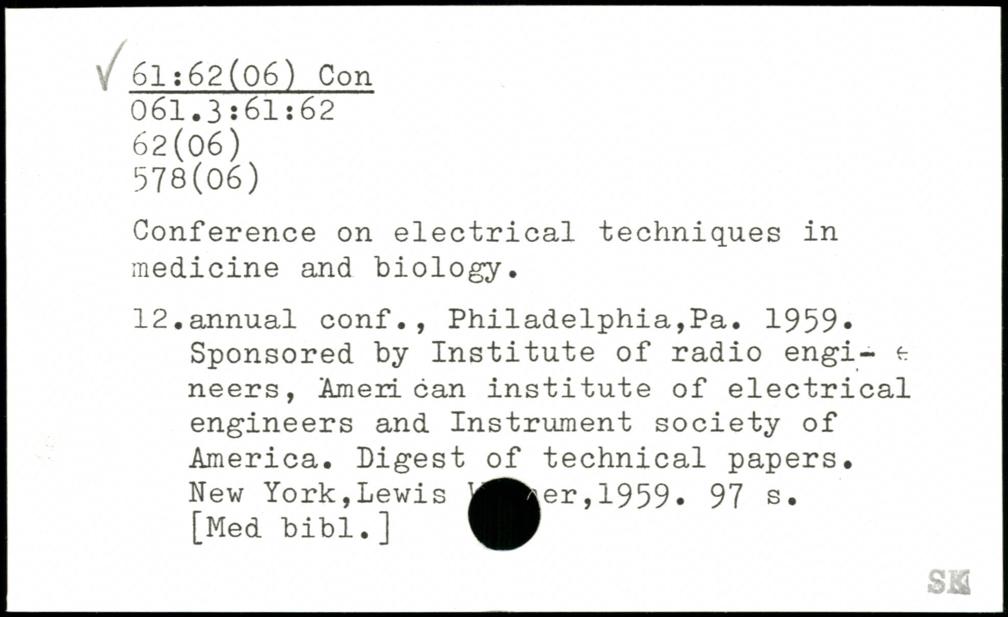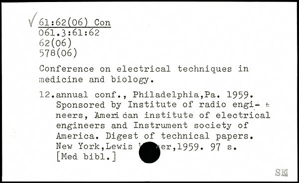 Conference on electrical techniques in medicine and biology. 12.annual conf., Philadelphia,Pa. 1959, Sponsored by Institute of radio engi- e neers, Ameri can institute of electrical engineers and Instrument society of America. Digest of technical papers. New York,Lewis j^^ker,1959.