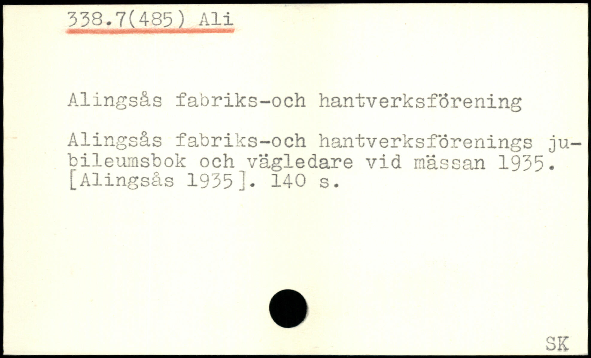 Alingsås fabriks-och hantverksförening Alingsås fabriks-och hantverksförenings ju-bileumsbok och vägledare vid mässan 1935. [Alingsås 1935].