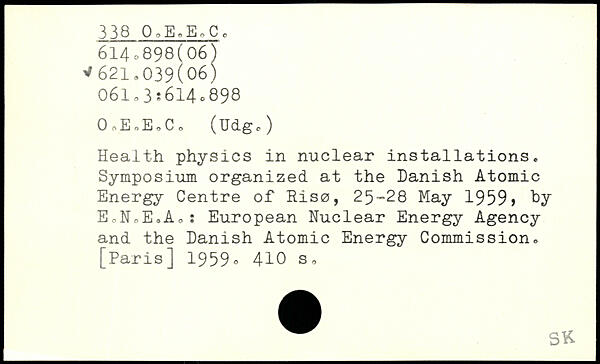 Health physics in nuclear installations. Symposium organized at the Danish Atomic Energy Centre of Rise, 25-28 May 1959, by EoNoE.Ao: European Nuclear Energy Agency and the Danish Atomic Energy Commission.