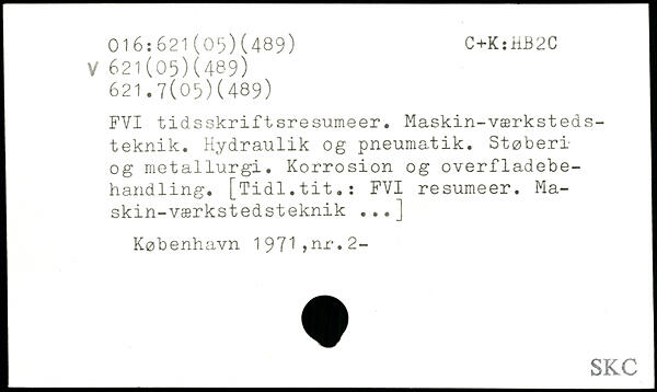 FVI tidsskriftsresumeer. Maskin-værkstedsteknik. Hydraulik og pneumatik. Støberi og metallurgi. Korrosion og overfladebehandling. [Tidl.tit.: FVI resumeer. Ma-skin-værkstedsteknik ...]