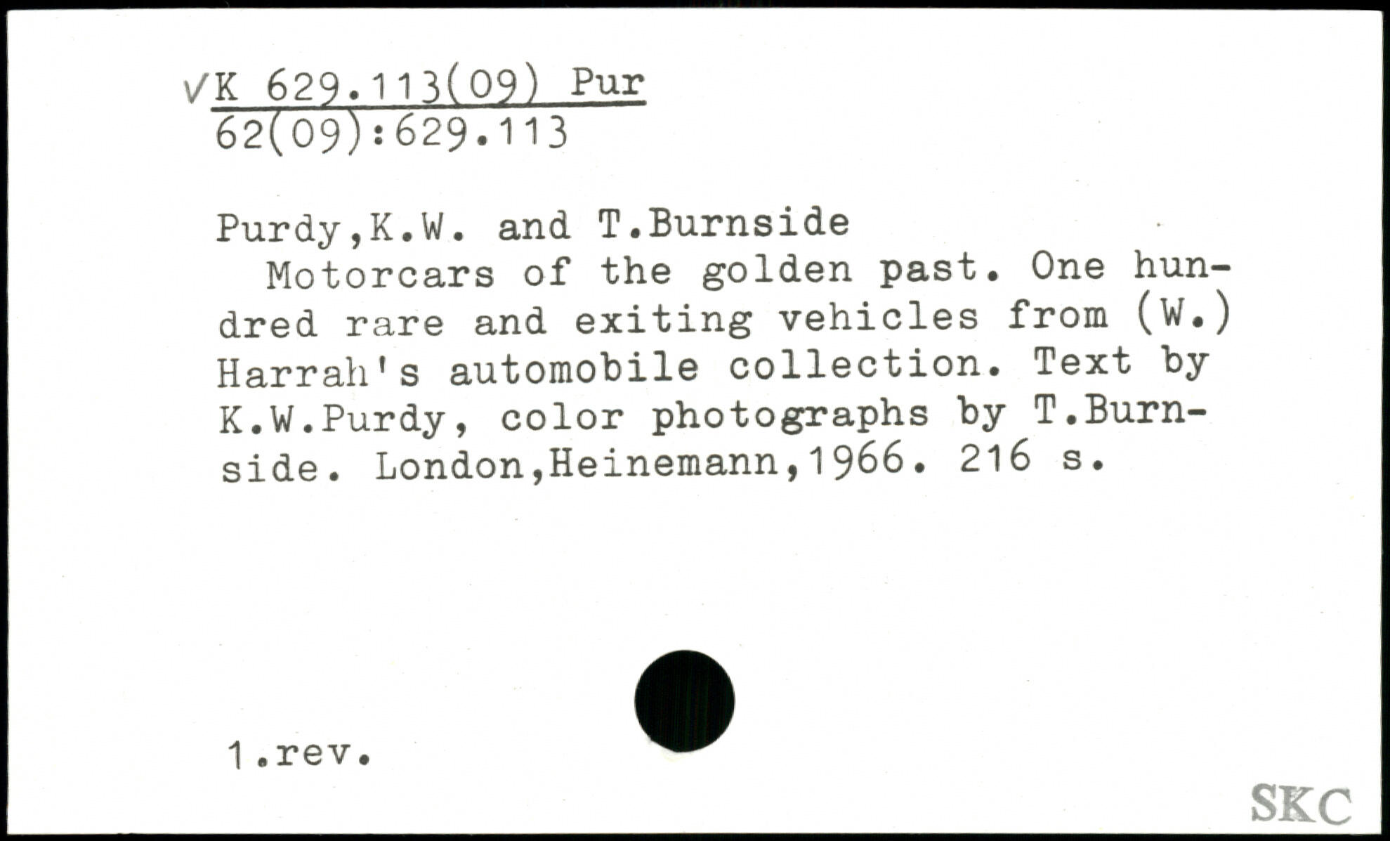 Motorcars of the golden past. One hundred rare and exiting vehicles from (W.) Hamah’s automobile collection. Text by K.W.Purdy, color photographs by T.Burnside.