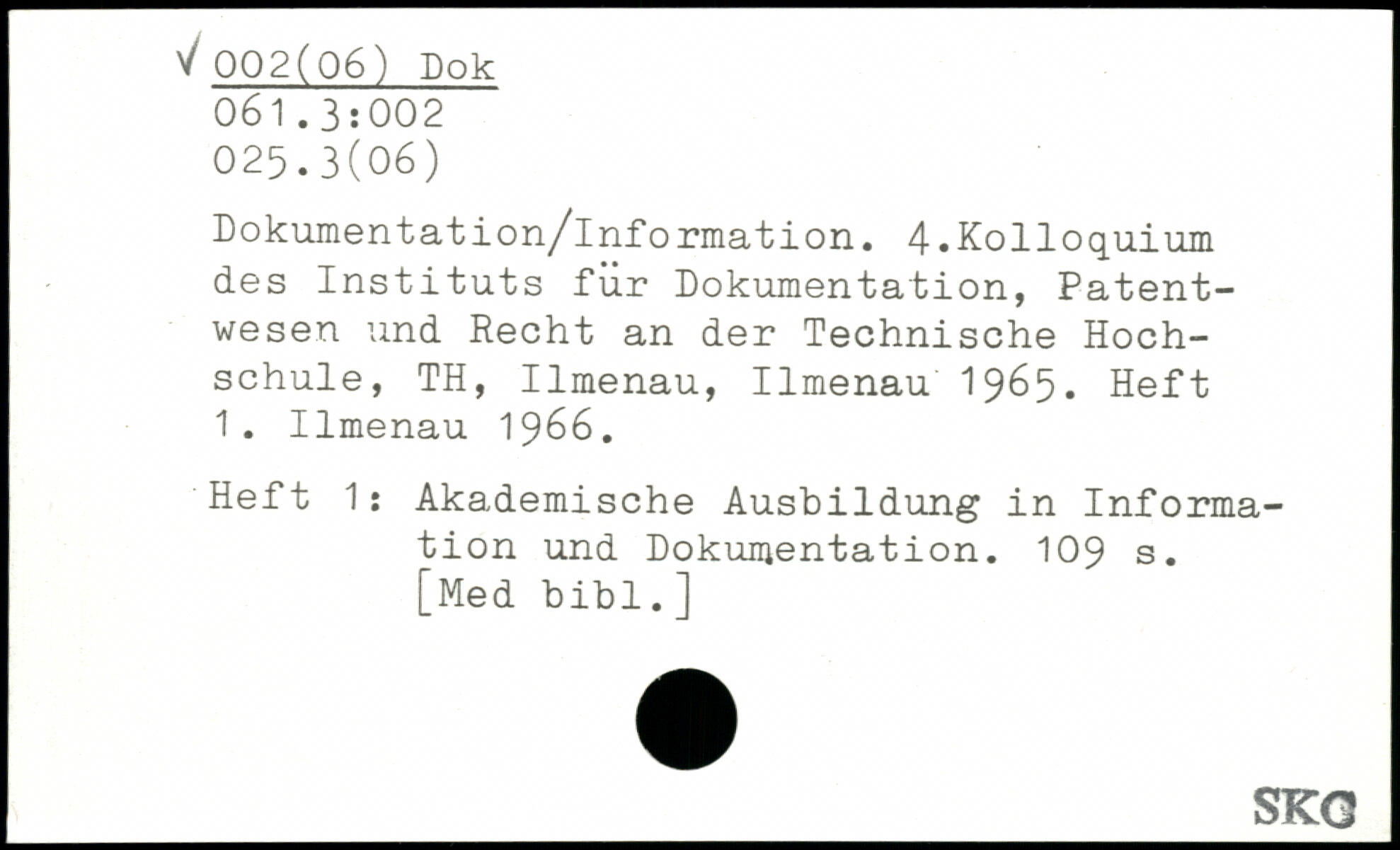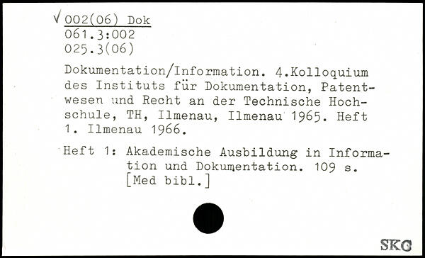 Dokumentation/lnformation. 4.Kolloquium des Instituts fur Dokumentation, Patentwesen und Recht an der Technische Hochschule, TH, Ilmenau, Ilmenau 1965. Heft 1. Ilmenau 1966. Heft 1: Akademische Ausbildung in Information und Dokumentation.