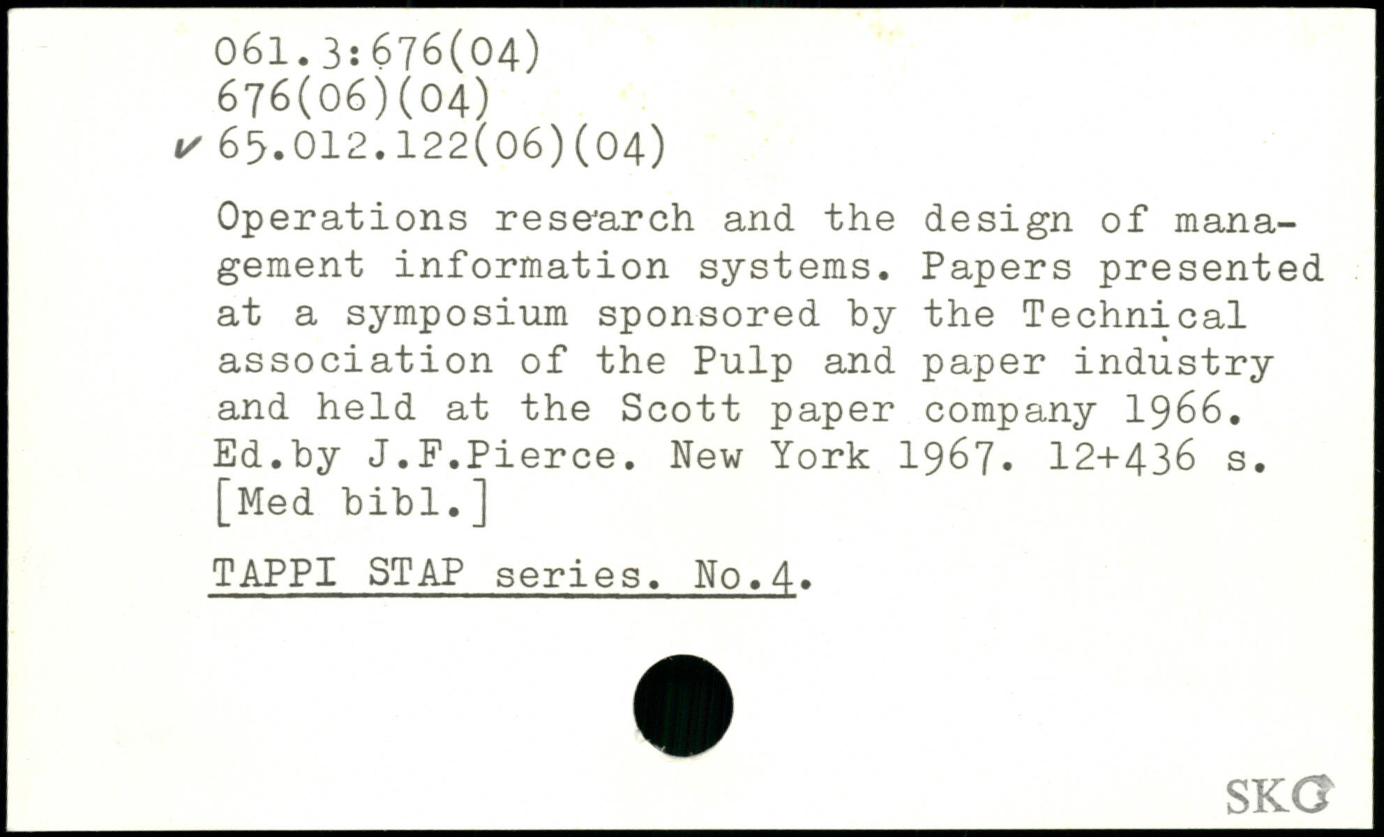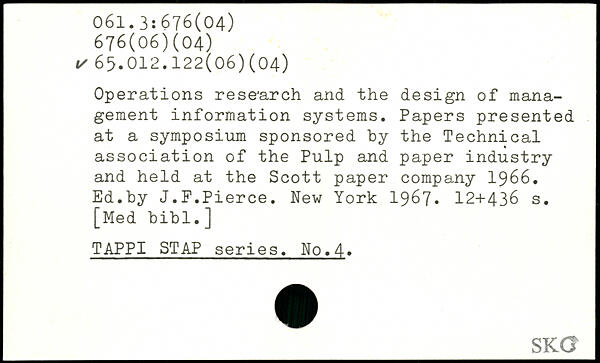 Operations research and the design of management information systems. Papers presented at a symposium sponsored by the Technical association of the Pulp and paper industry and held at the Scott paper company 1966. Ed.by J.F.Pierce.