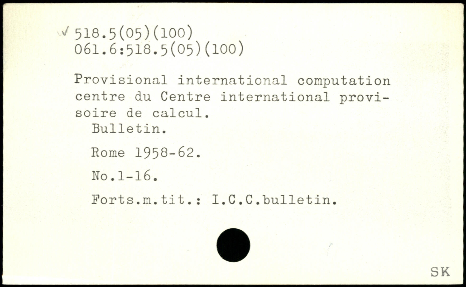 Provisional international computation centre du Centre international provisoire de calcul. Bulletin. Rome 1958-62. No.1-16. Forts.m.tit.: I.C.C.Bulletin.