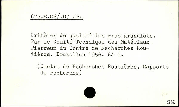 Critères de qualité des gros granulats. Par le Comité Technique des Matériaux Pierreux du Centre de Recherches Routières.