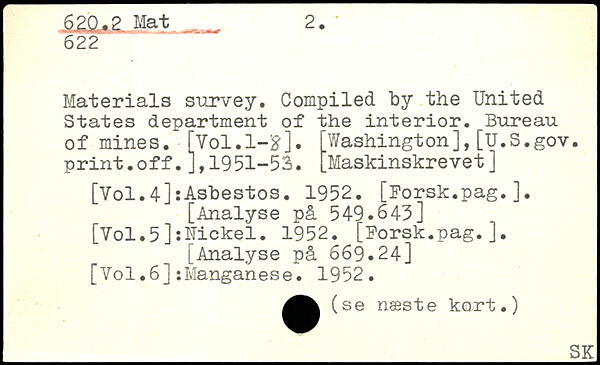 Materials survey. Compiled by the United States department of the interior. Bureau of mines.' [Vol.l-F]. [Washington],[U.S.gov. print.off.J,1951-53. [Maskinskrevet]