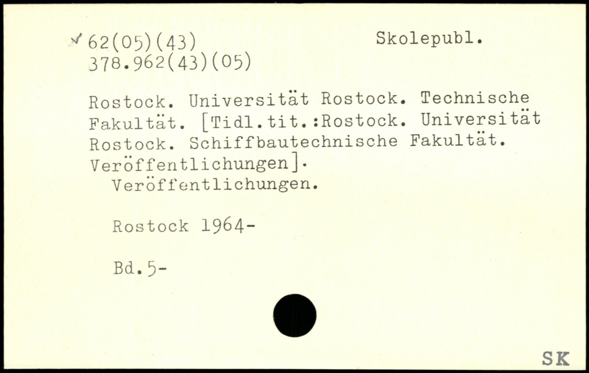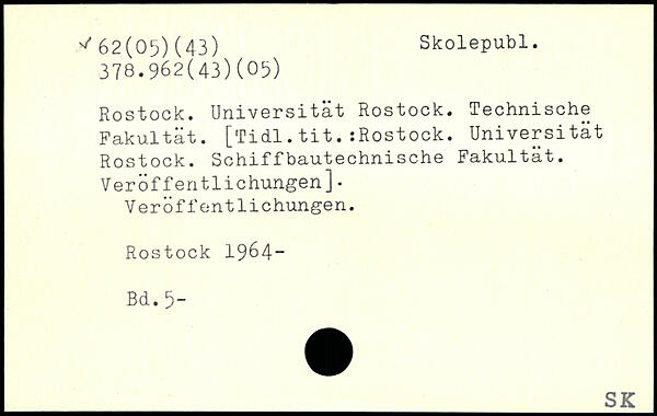 Rostock. Universität Rostock. Technische Fakultät. [Tidl. tit.-.Rostock. Universität Rostock. Schiffbautechnische Fakultät. Veröffentlichungen]. Veröffentlichungen. Rostock 1964- Bd. 5“