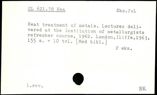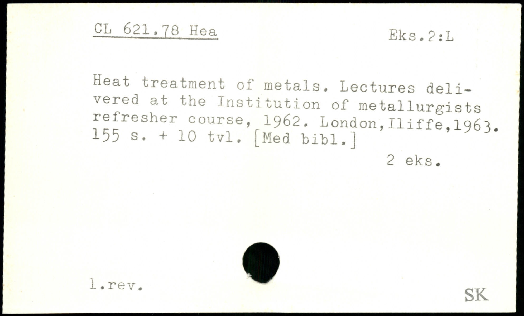 Heat treatment of metals. Lectures delivered at the Institution of metallurgists refresher course, 1962.