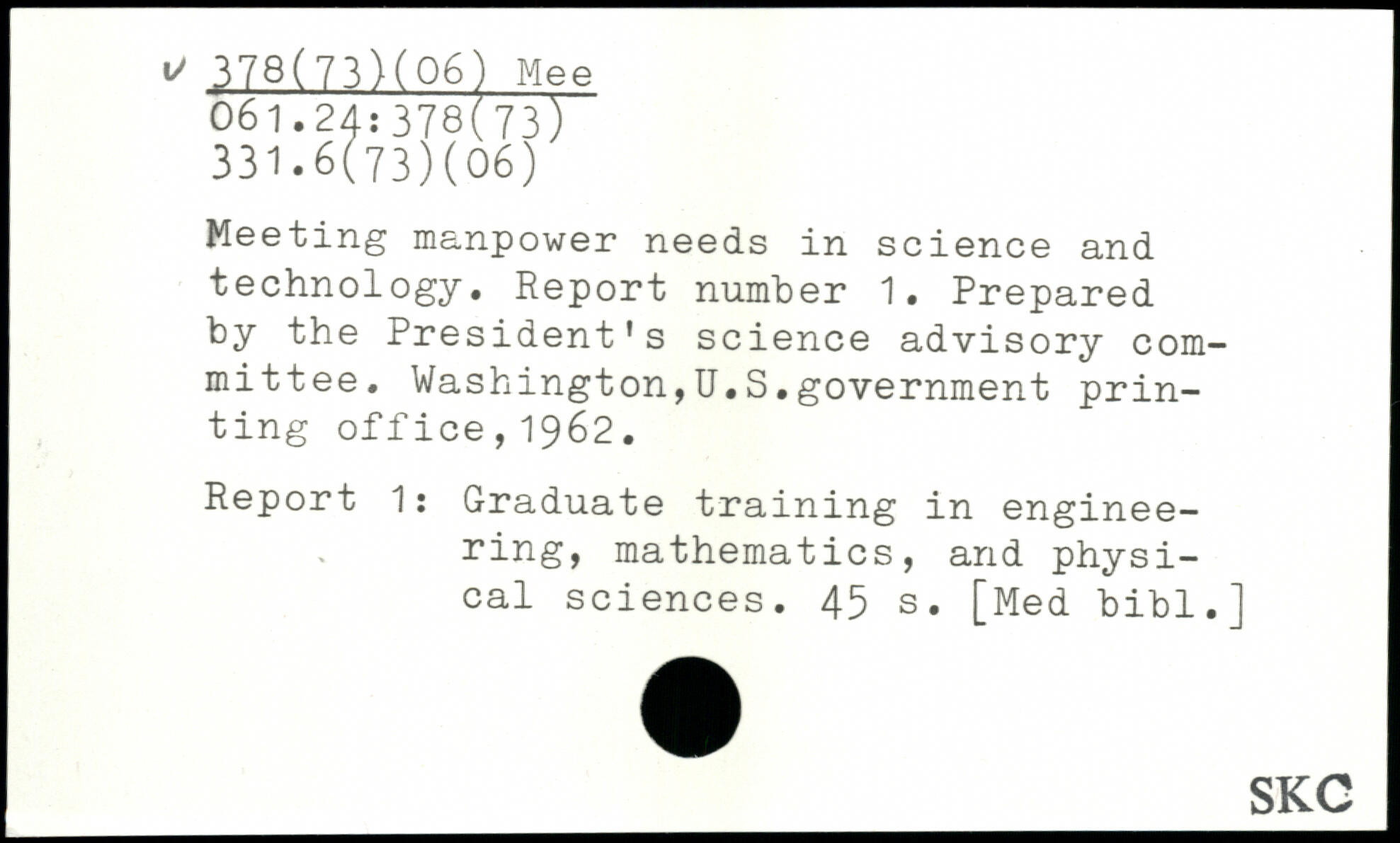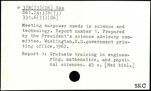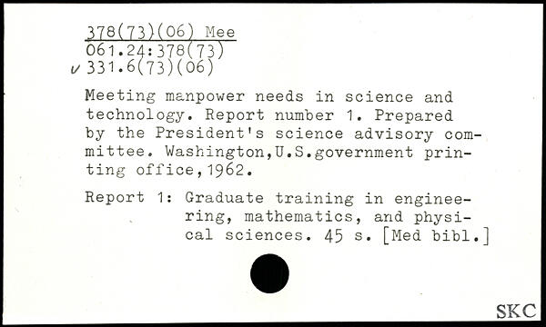 Meeting manpower needs in science and technology. Report number 1. Prepared by the President's science advisory committee. Washington,U.S.government printing office,1962. Report 1: Graduate training in engineering, mathematics, and physical sciences.