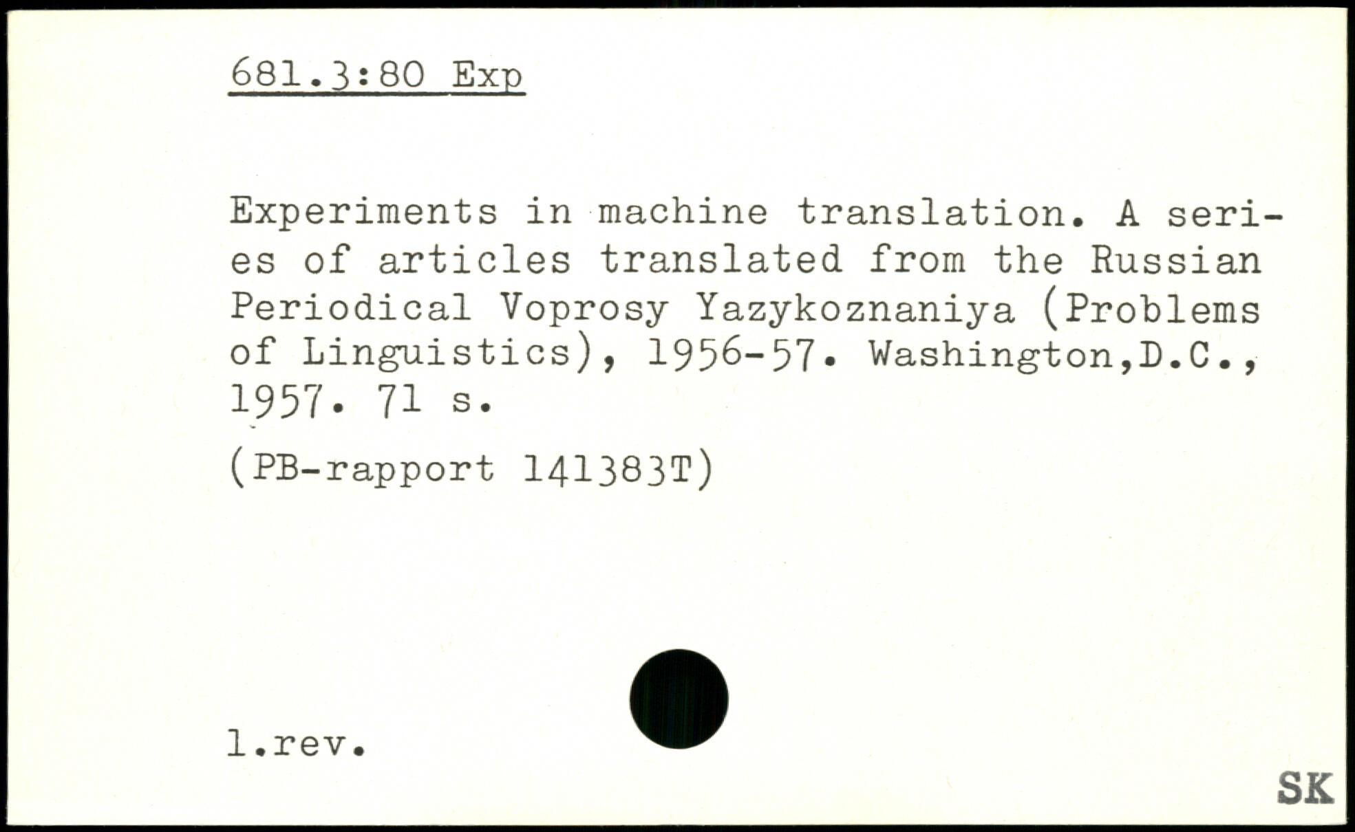 Experiments in machine translation. A series of articles translated from the Russian Periodical Voprosy Yazykoznaniya (Problems of Linguistics), 1956-57