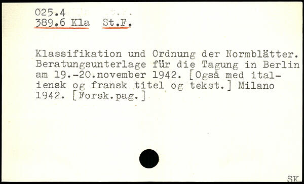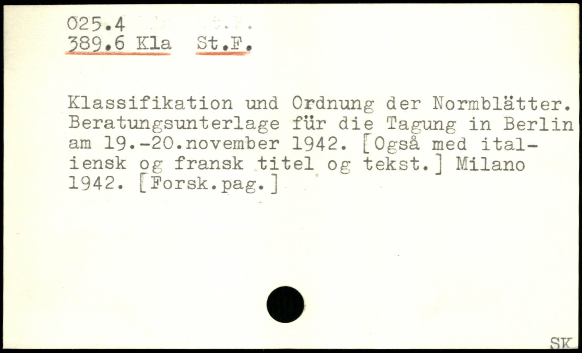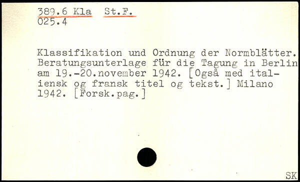 mrt— Klassifikation und Ordnung der Normblätter. Beratungsunterlage für die Tagung in Berlin am 19.-20.november 1942. [Også med italiensk og fransk titel og tekst.] Milano 1942. [Forsk.pag.]