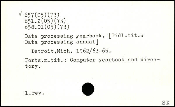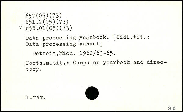 Data processing yearbook. [Tidl.tit.: Data processing annual] Detroit,Mich. 1962/63-65. Forts.m.tit.s Computer yearbook and directory.