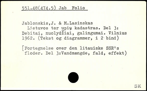 Uetuvos tsr upfy. kadastras. Del 3: Debitai, nuolydziai, galingumai. Vilnius 1962. (Tekst og diagrammer, i 2 bind) [Fortegnelse over den litauiske SSR’s floder. Del 3:Vandmængde, fald, effekt)