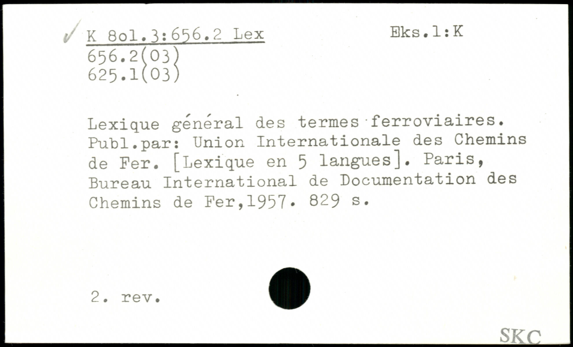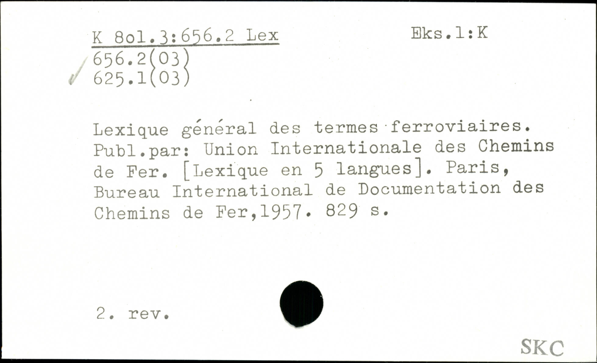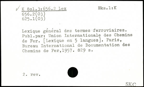 Lexique général des termes.ferroviaires. Publ.par: Union Internationale des Chemins de Fer. [Lexique en 5 langues]. Paris, Bureau International de Documentation des Chemins de Fer,1957