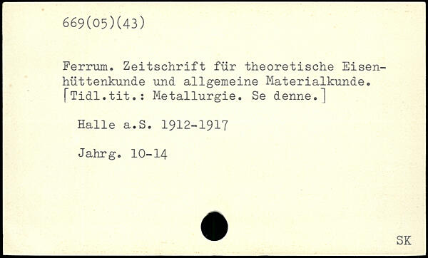 Ferrum. Zeitschrift für theoretische Eisenhüttenkunde und allgemeine Materialkunde. [Tidl.tit.: Metallurgie. Se denne.] Halle a.S. 1912-1917 Jahrg. 10-14