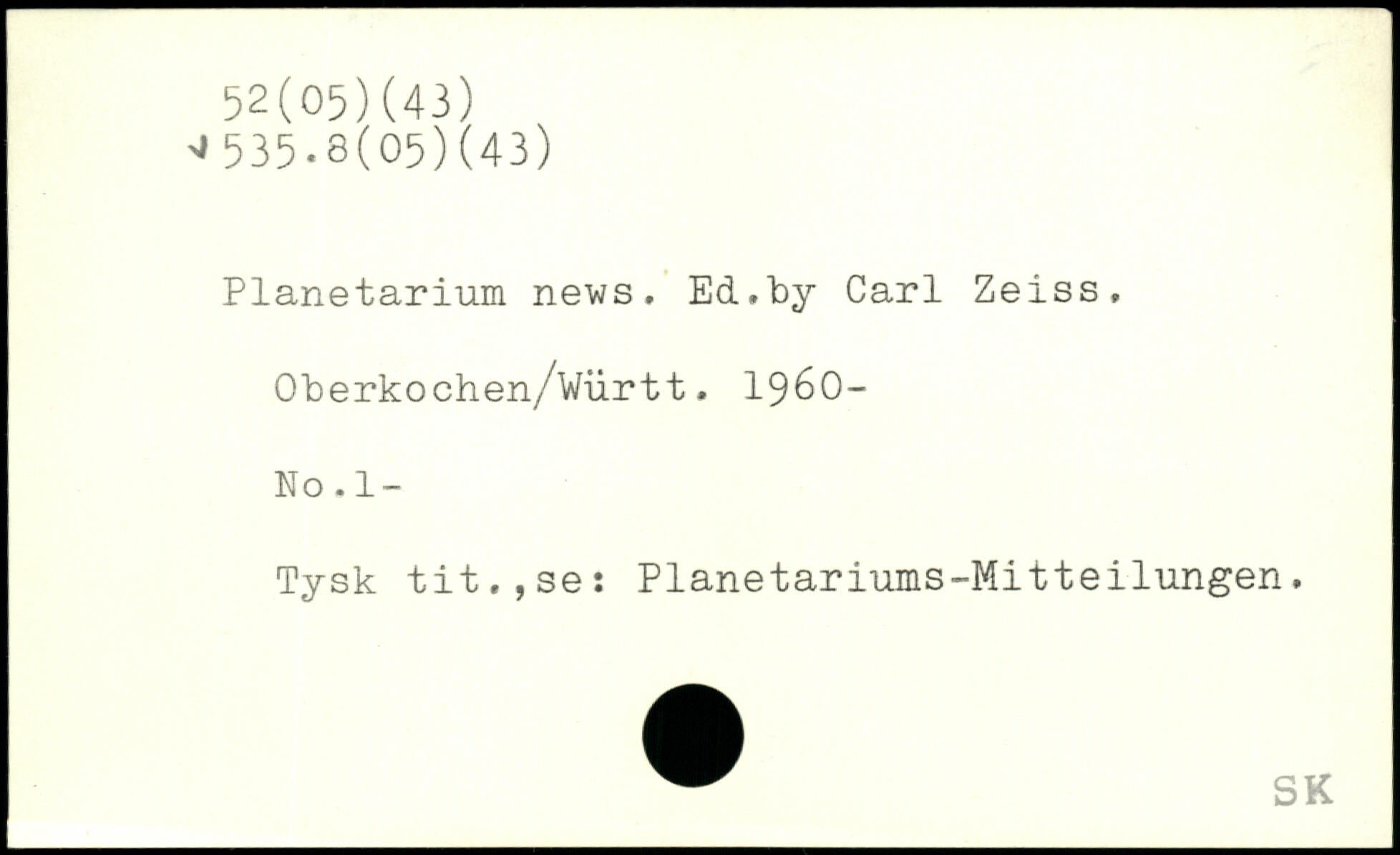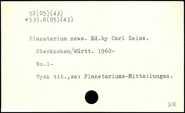Planetarium news. Ed,by Carl Zeiss, Oberkochen/wiirtt. 1960-No.1- Tysk tit.,set Planetariums-Mitteilungen.
