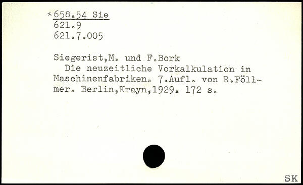 Siegerist,M, und F.Bork Die neuzeitliche Vorkalkulation in Maschinenfabriken.