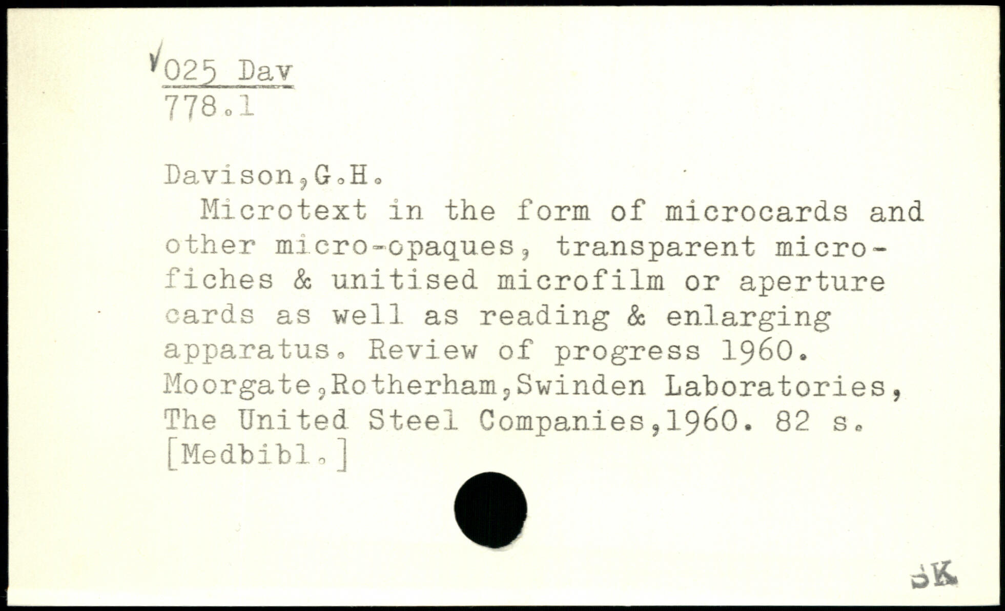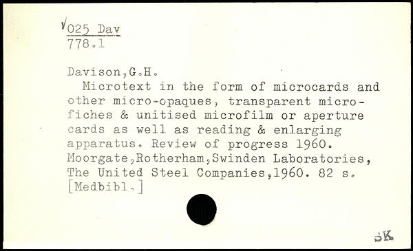 Davison-?GoH0 Microtext in the form of microcards and other micro-opaques, transparent microfiches & unitised microfilm or aperture cards as well as reading & enlarging apparatus,, Review of progress 1960. Moorgate 3Rotherham