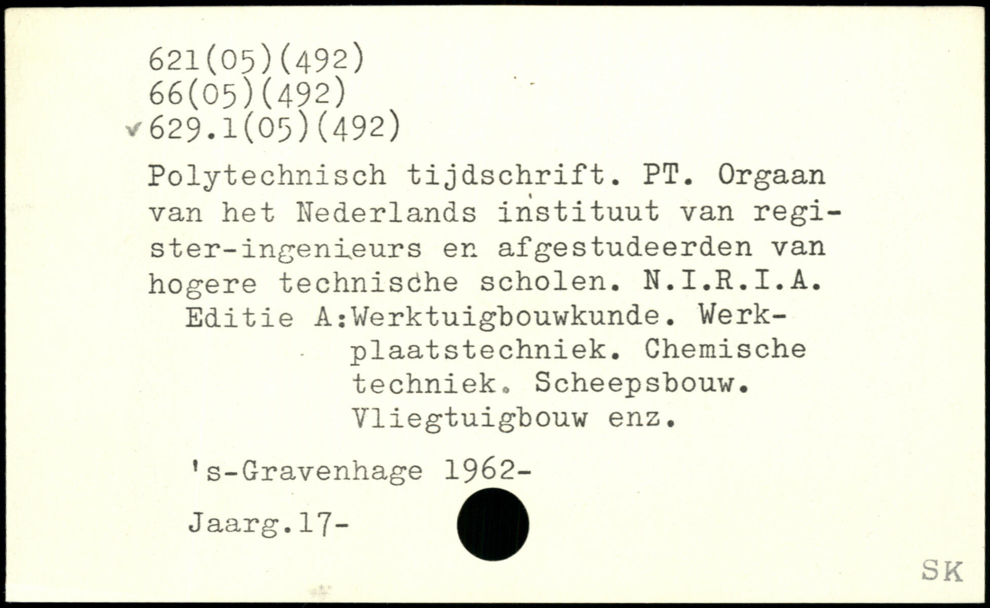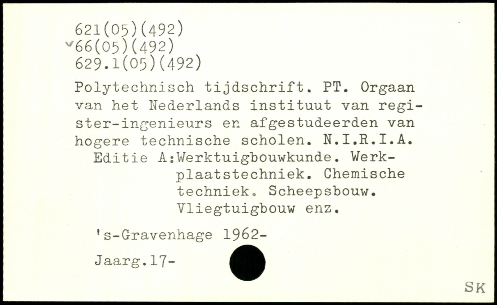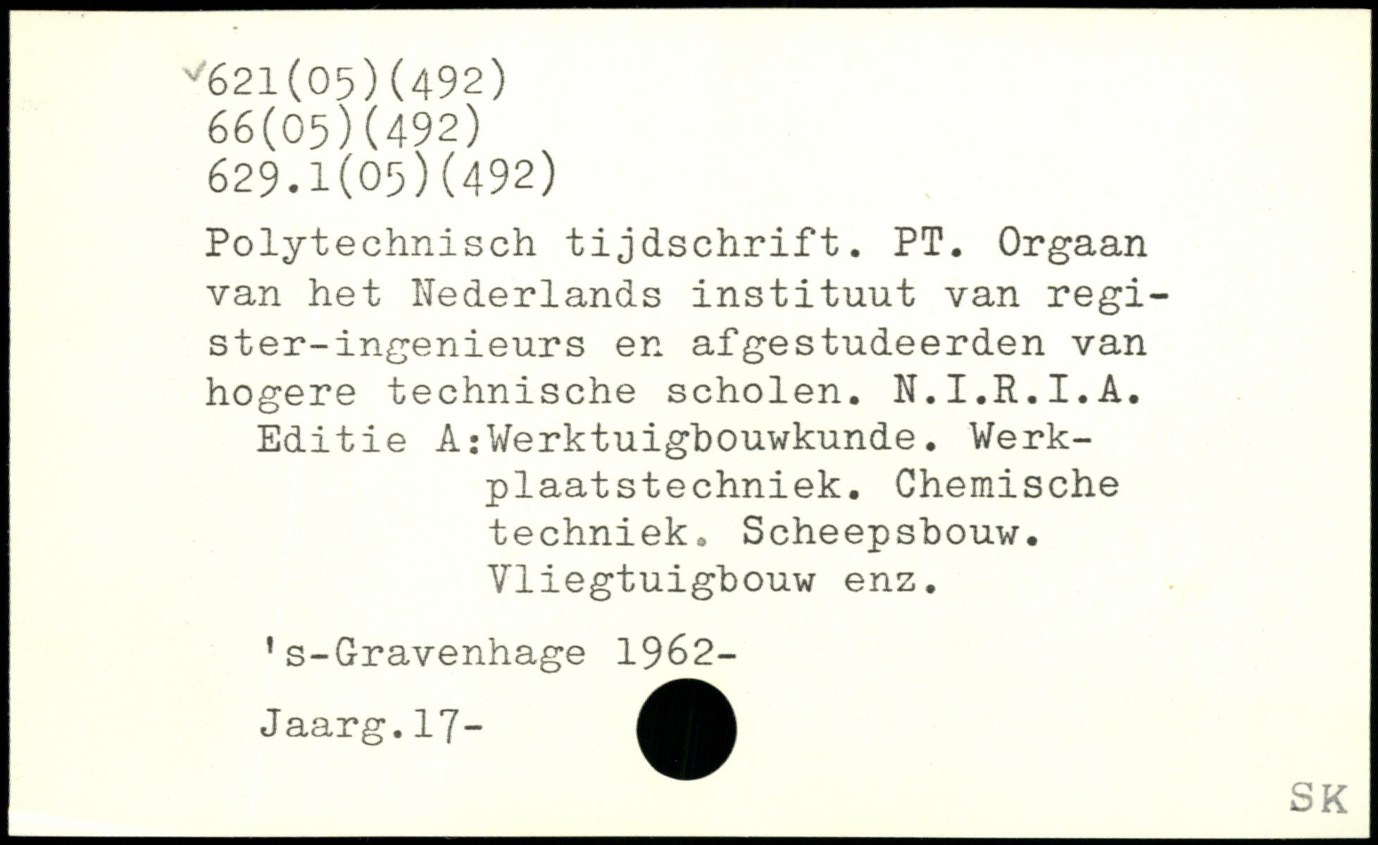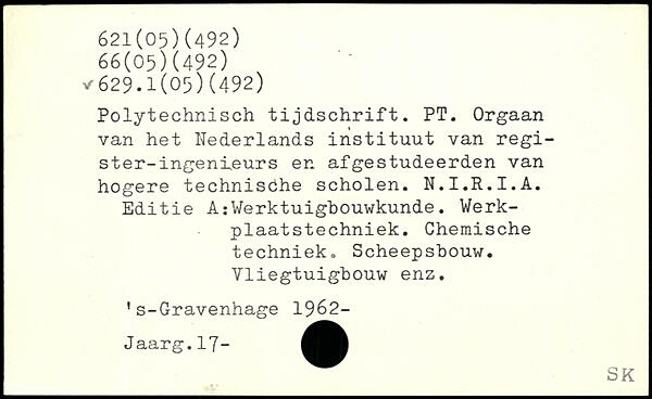 Polytechnisch tijdschrift. PT. Orgaan van het Nederlands instituut van regi-ster-ingenieurs en afgestudeerden van hogere technische scholen. N.I.R.I.A. Editie A:Werktuigbouwkunde. Werk-plaatstechniek. Chemische techniek. Scheepshouw. Vliegtuigbouw enz. ’s-Gravenhage 1962- J aarg .17-