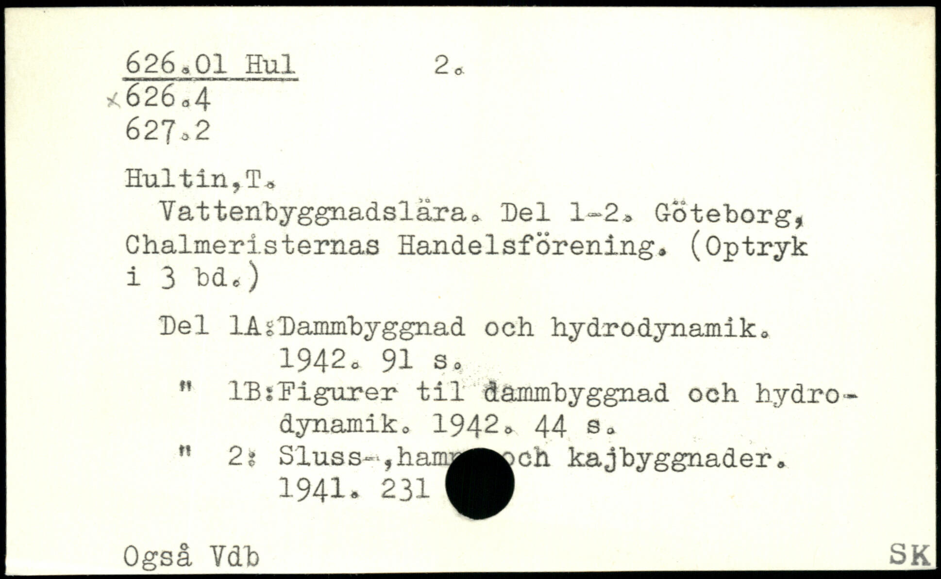 Yattenbyggnadslära. Del 1-2. Göteborg, Chalmeristernas Handelsförening. (Optryk i 3 bd.) Del 1AsDammbyggnad och hydrodynamik. 1942