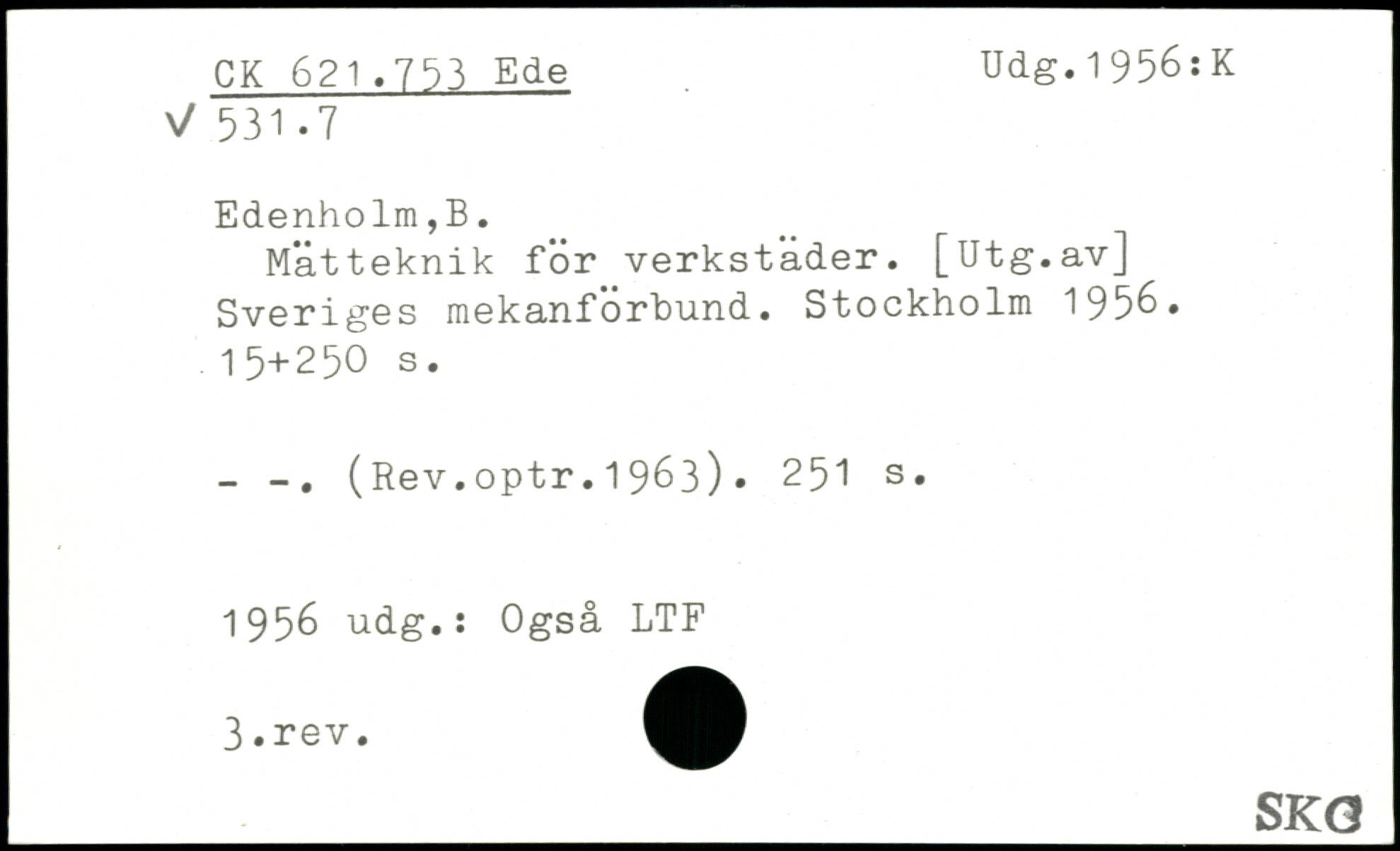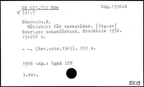 Mätteknik för verkstader. [Utg.av] Sveriges raekanförbund. Stockholm 195&. 15+25O s. - (Rev.optr.1963).