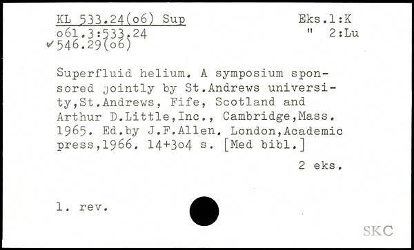Superfluid helium. A symposium sponsored jointly by St.Andrews university , St. Andrews , Fife, Scotland and Arthur D.Little,Inc., Cambridge,Mass. 1965. Ed.by J.F.Allen.