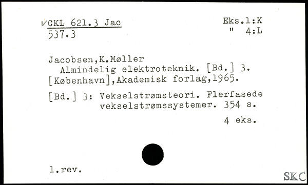 Jacobsen,K.Møller Almindelig elektroteknik. [Bd. ] 3. [København],Akademisk forlag,1965. [Bd.] 3: Vekselstrømsteori. Flerfasede vekselstrømssystemer.