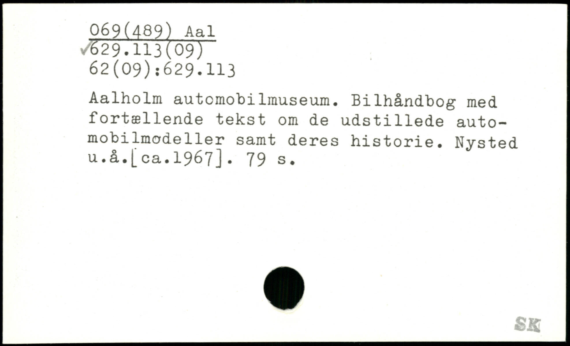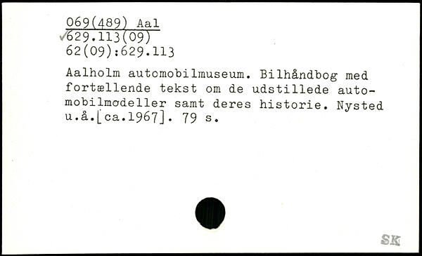 Aalholm automobilrauseum. Bilhåndbog med fortællende tekst om de udstillede automobilmodeller samt deres historie. Nysted u. å.