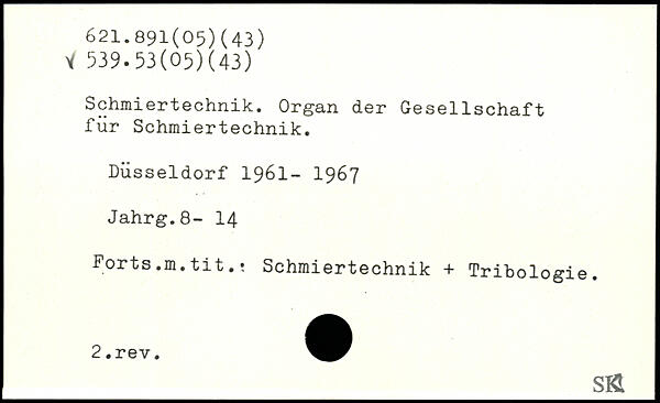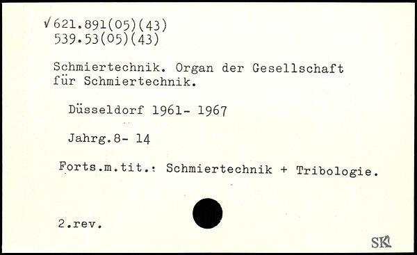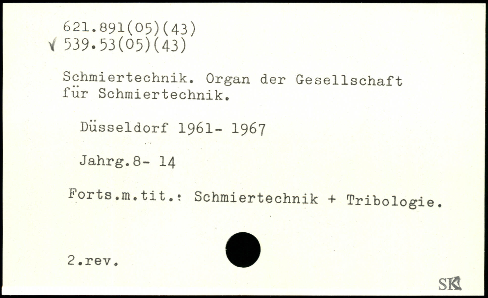 Schmiertechnik. Organ der Gesellschaft für Schmiertechnik. Düsseldorf 1961- 1967 Jahrg.8- 14 Forts,m.tit.. Schmiertechnik + Tribologie.