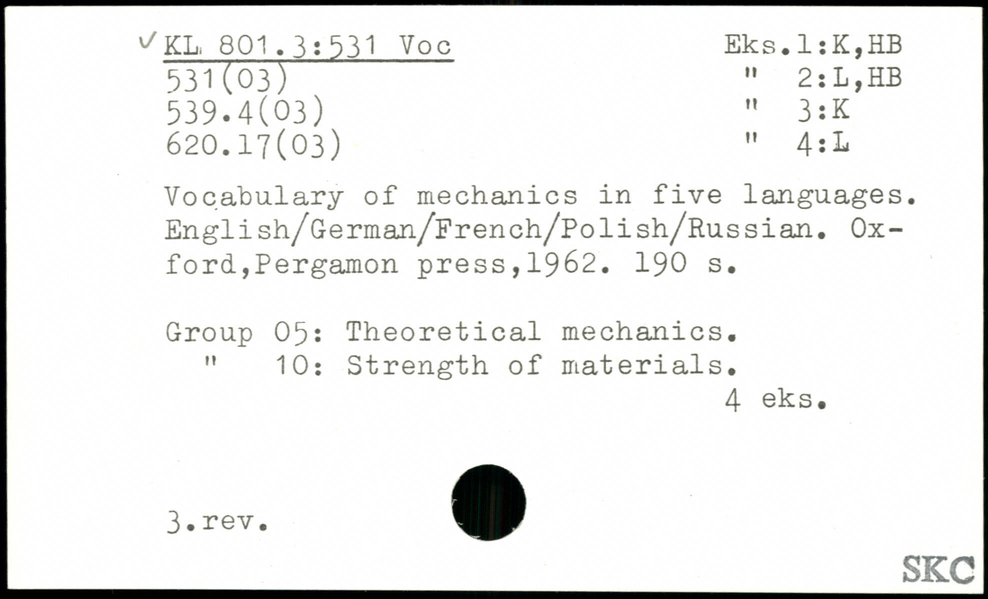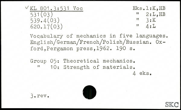 Vocabulary of mechanics in five languages. English/German/French/Polish/Russian.