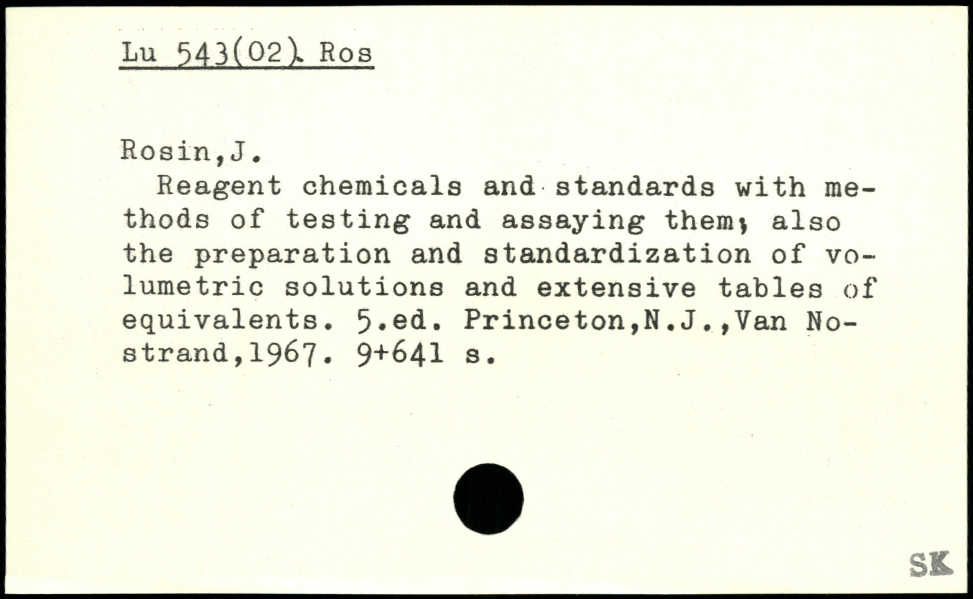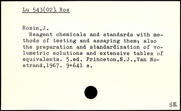 Reagent chemicals and standards with methods of testing and assaying them. also the preparation and standardization of volumetric solutions and extensive tables of equivalents. Princeton,N.JVan No strand, 19^7