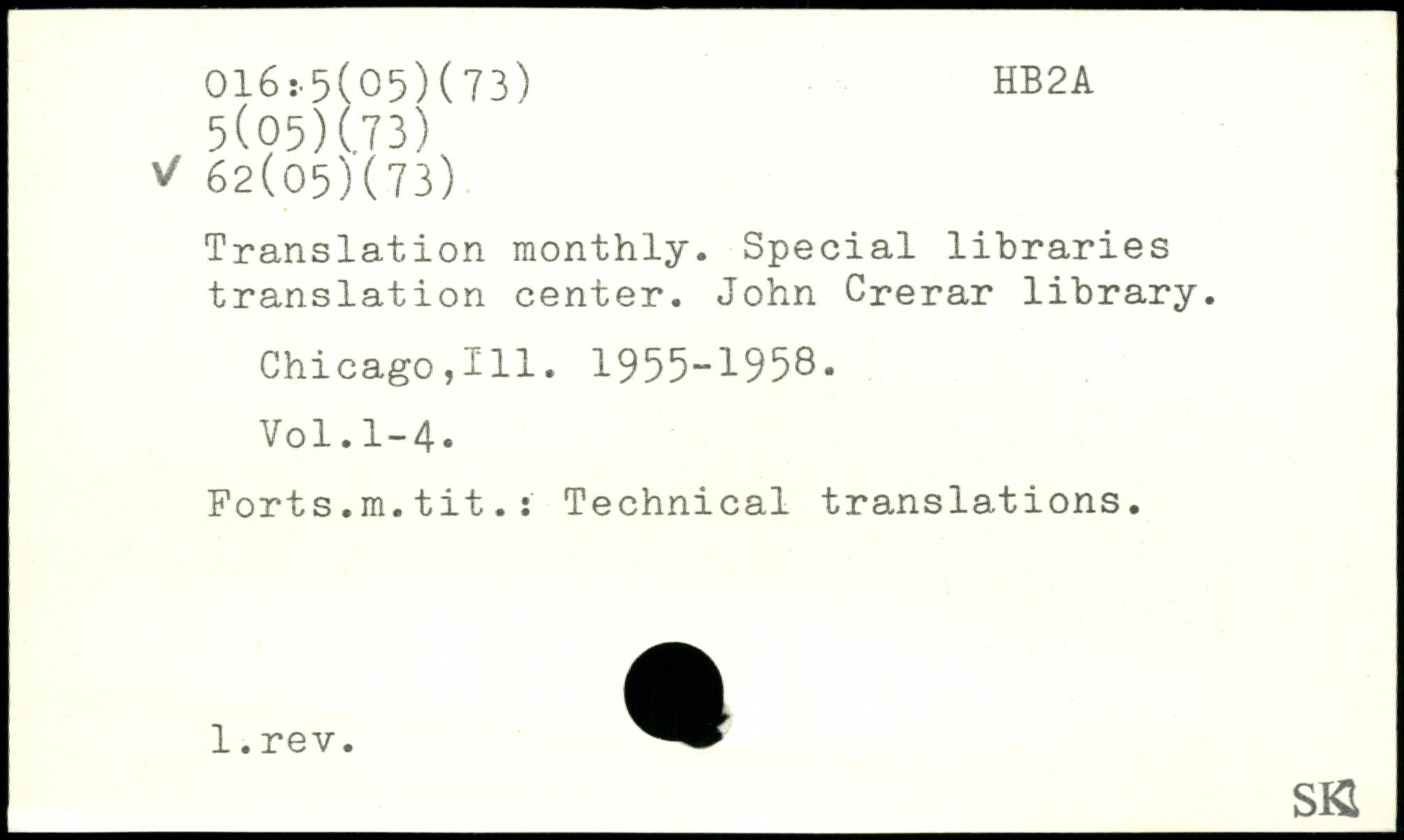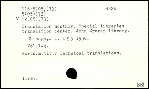 Translation monthly. Special libraries translation center. John Crerar library. Chicago,HI. 1955-1958. Forts.m.tit.: Technical translations. ____