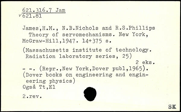 James,H.M., N.B.Nichols and R.S.Ph1111ps Theory of servomechanisms.