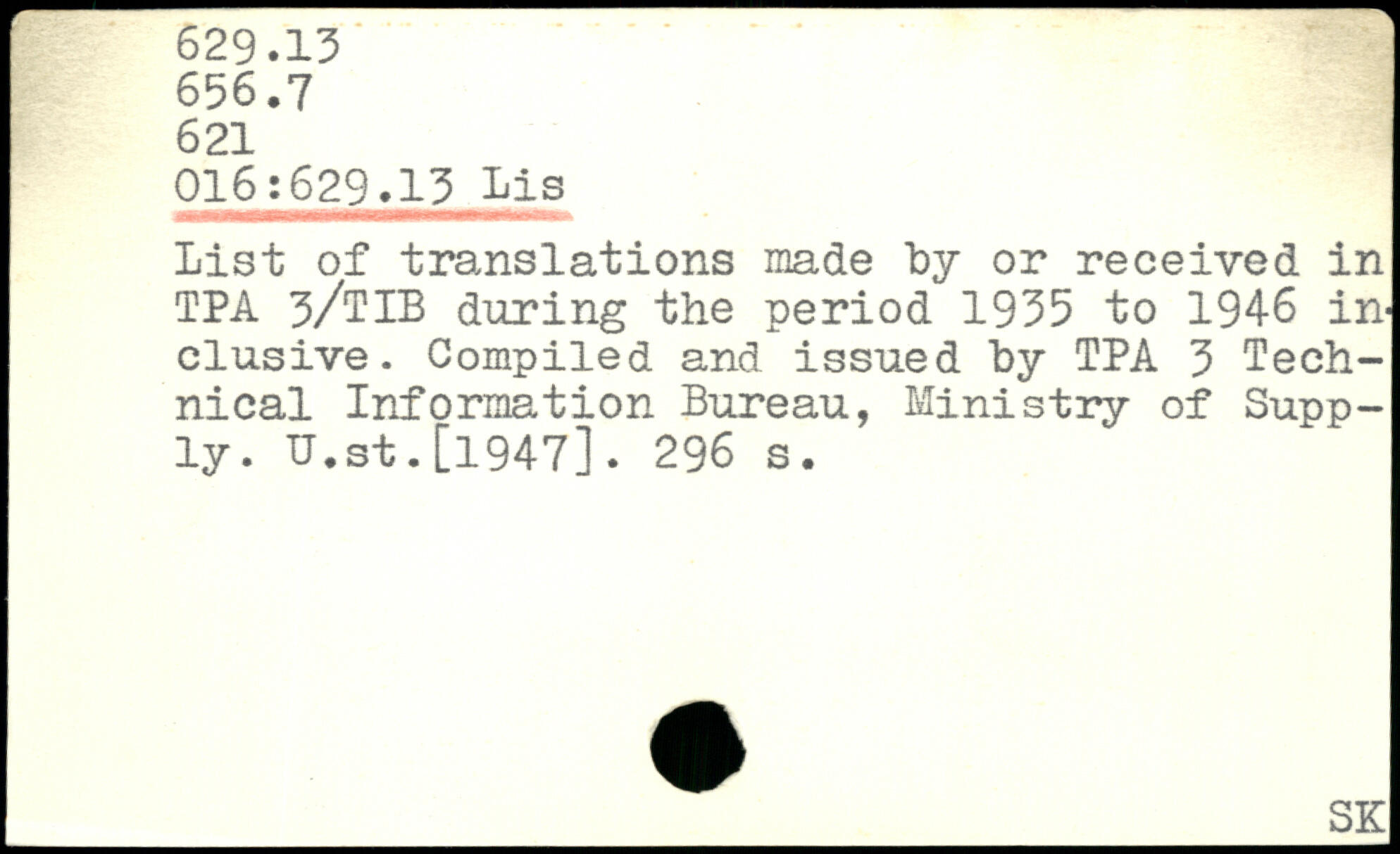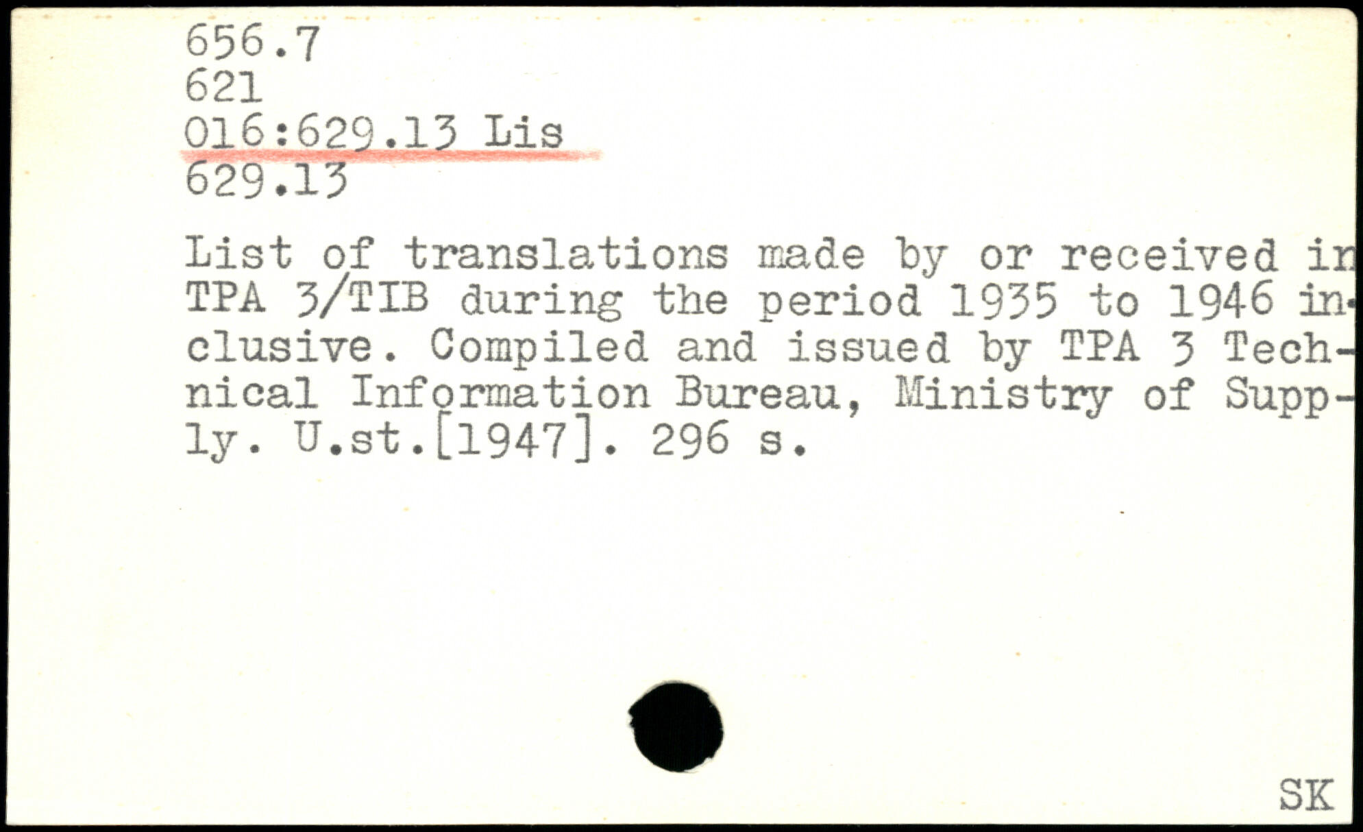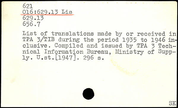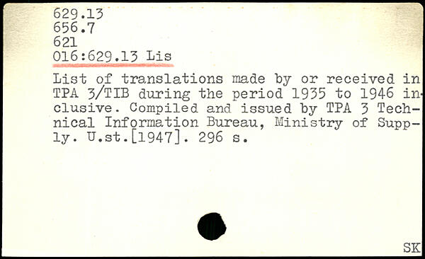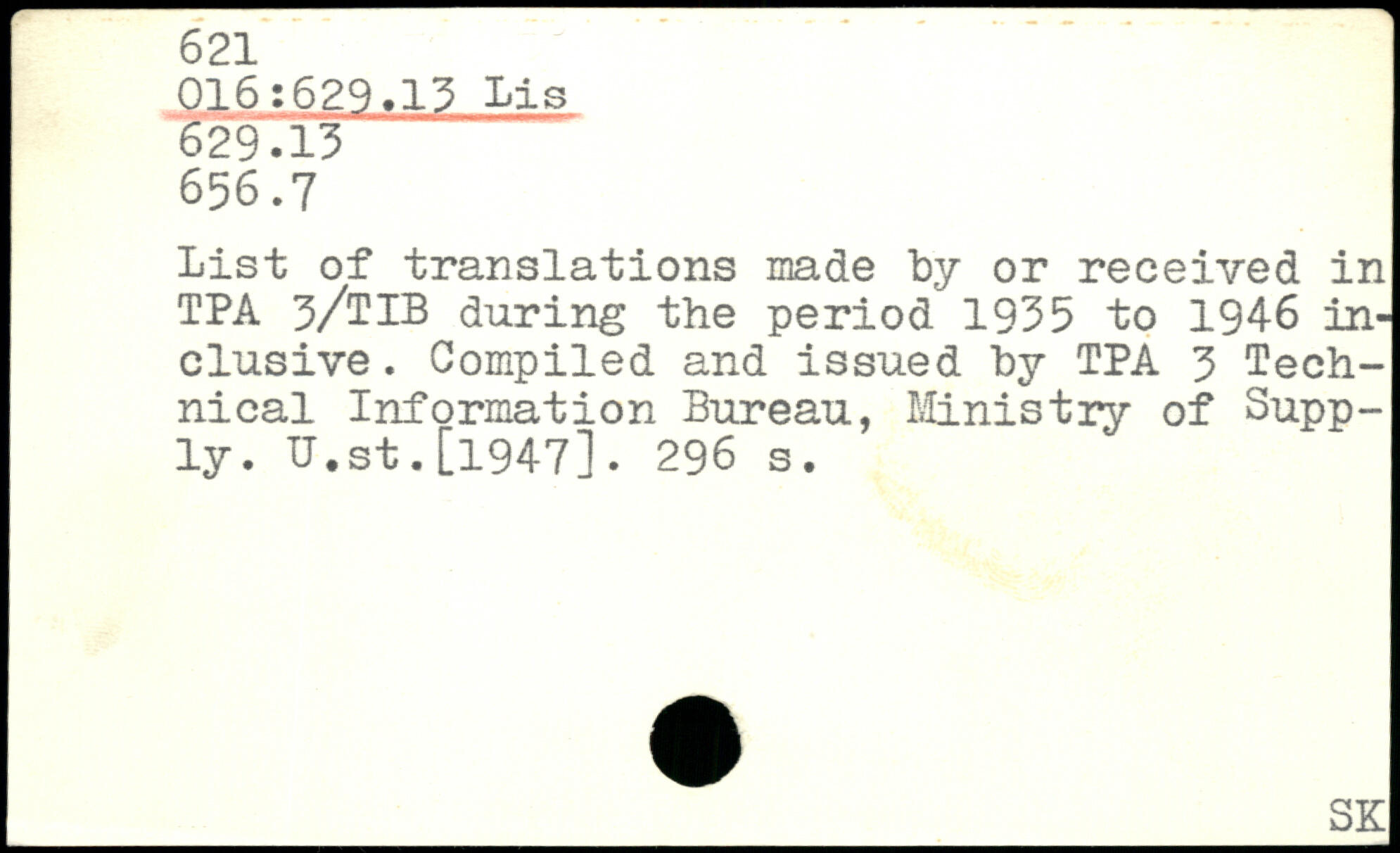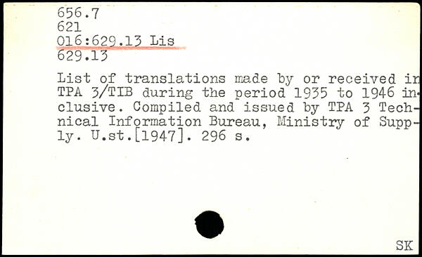 List of translations made by or received in TPA 3/TIB during the period 1935 to 194-6 inclusive. Compiled and issued by TPA 3 Technical Information Bureau, Ministry of Supp-1y. U.st.[1947].