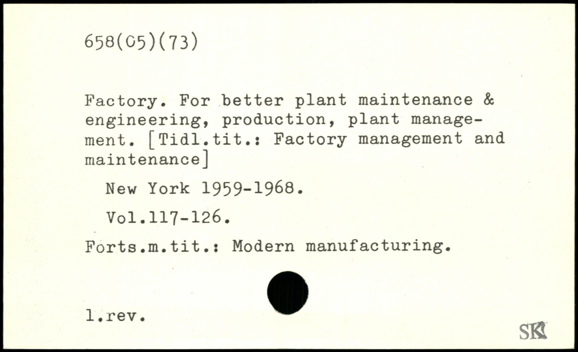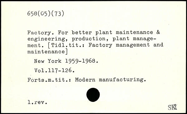 Factory. For better plant maintenance & engineering, production, plant management. [Tidl.tit.: Factory management and maintenance]