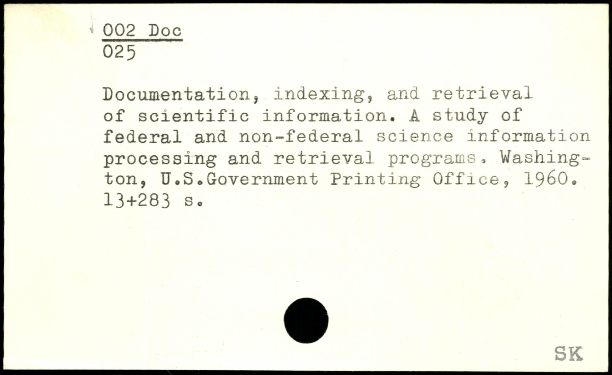 Documentation, indexing, and retrieval of scientific information. A study of federal and non-federal science information processing and retrieval programs, Washington, U.S.Government Printing Office, 1960.