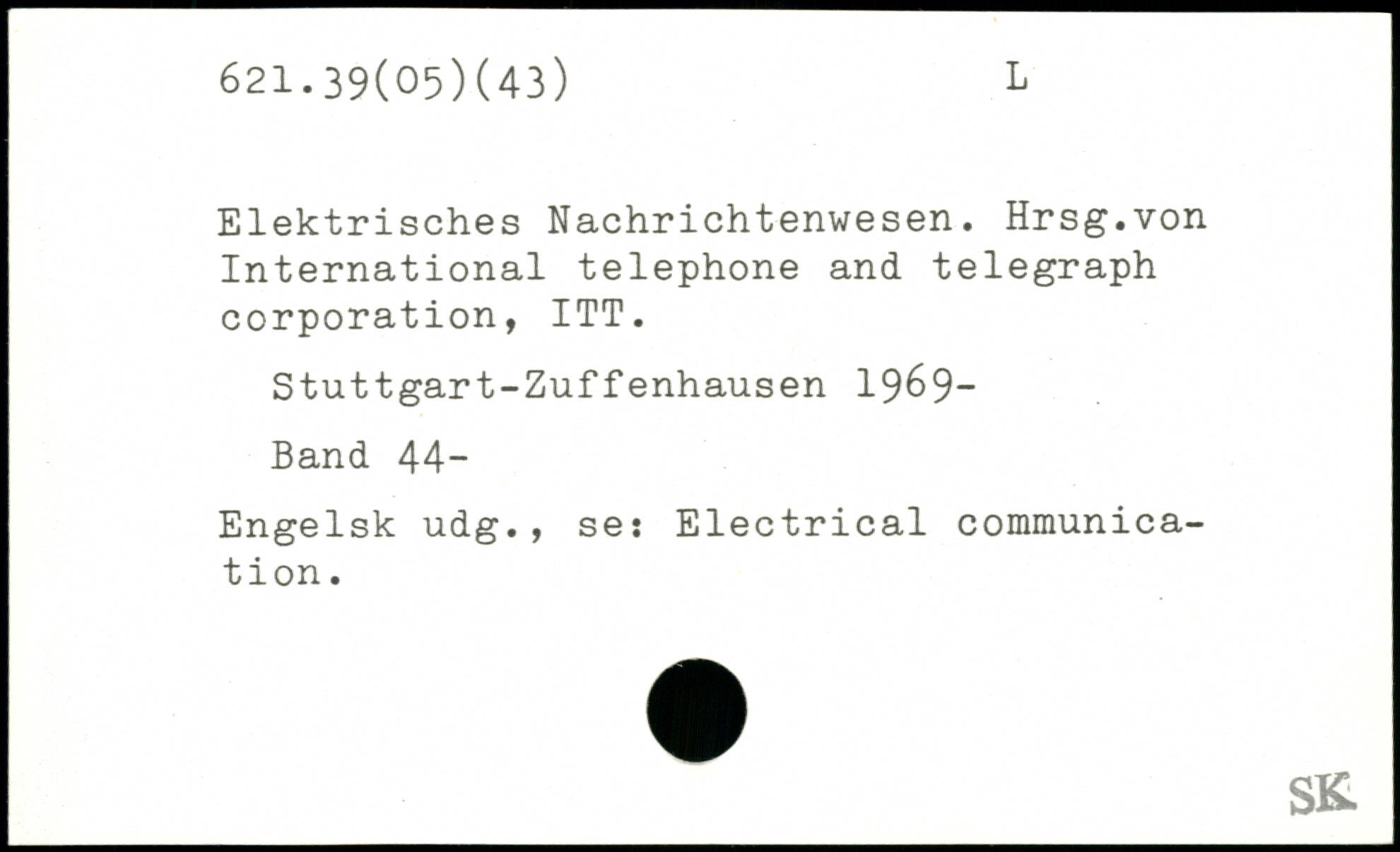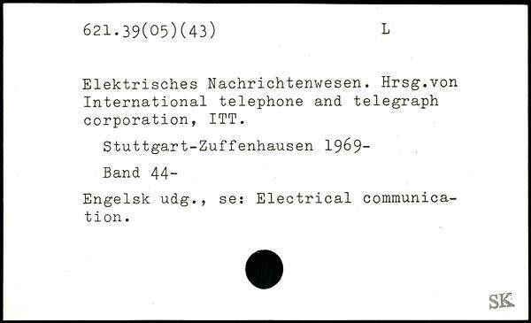 Elektrisches Nachrichtenwesen. Hrsg.von International telephone and telegraph Corporation, ITT. Stuttgart-Zuffenhausen 1969- Band 44- Engelsk udg., se: Electrical communication. sa