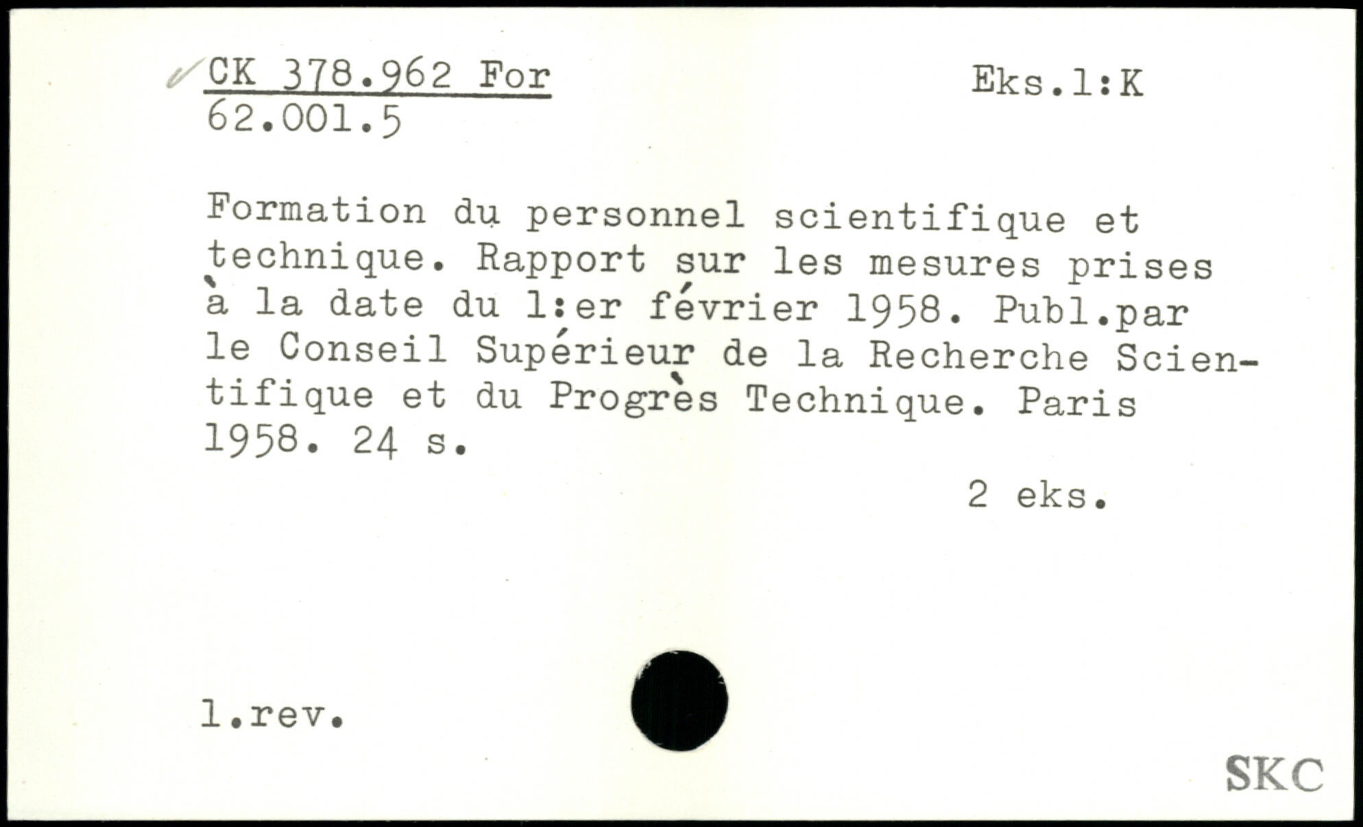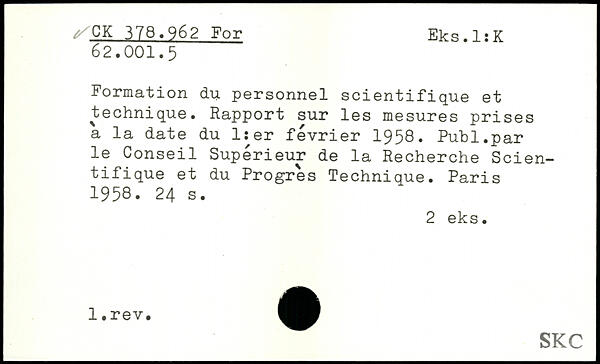 Formation du personnel scientifique et technique. Rapport sur les mesures prises a la date du lier février 1958, Publ.par le Conseil Supérieur de la Recherche Scientifique et du Progrès Technique.