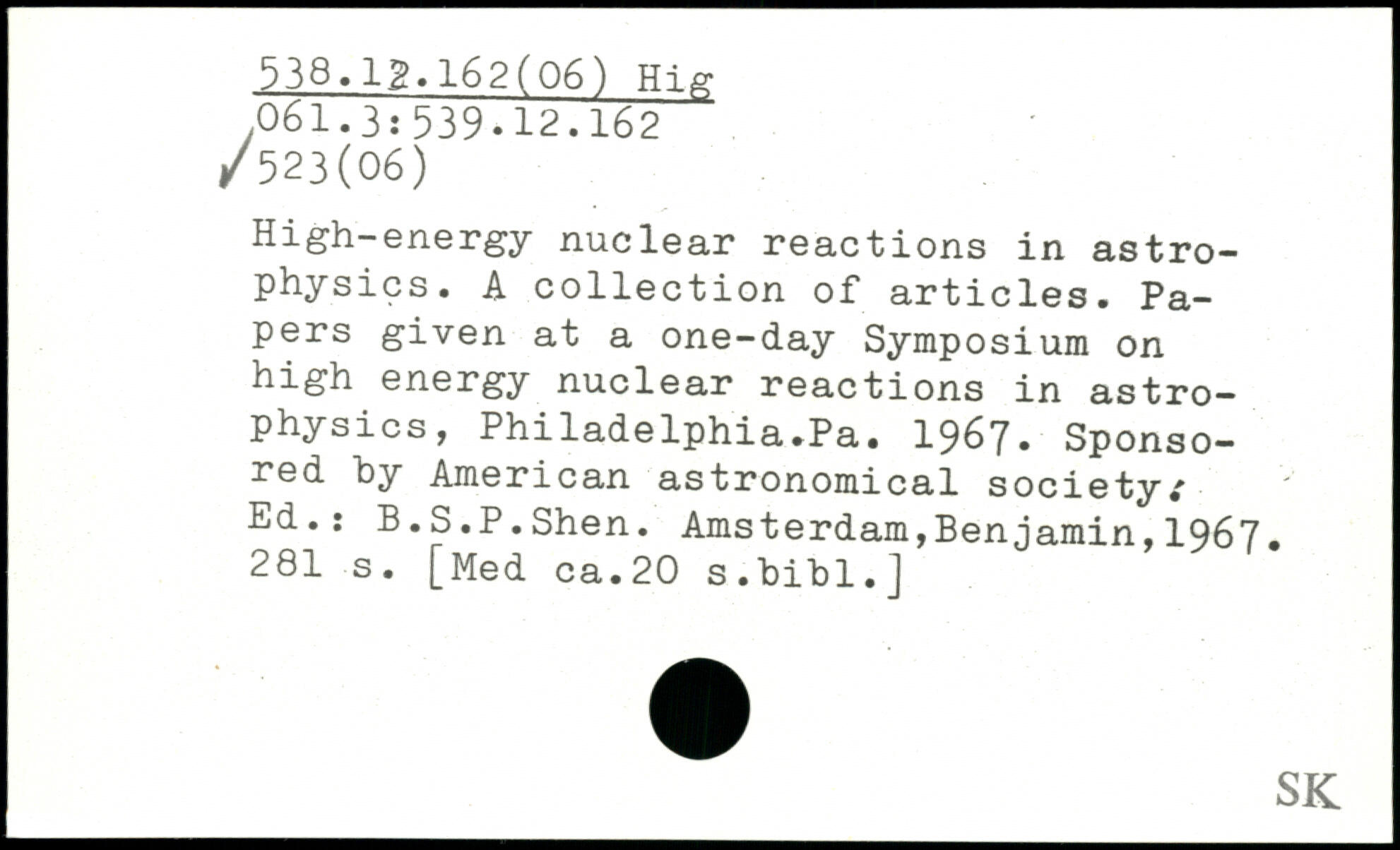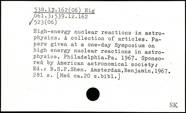 High-energy nuclear reactions in astrophysics. A collection of articles. Papers given at a one-day Symposium on high energy nuclear reactions in astrophysics, Philadelphia.Pa. 1967. Sponsored by American astronomical society/ Ed.: B.S.P.Shen.