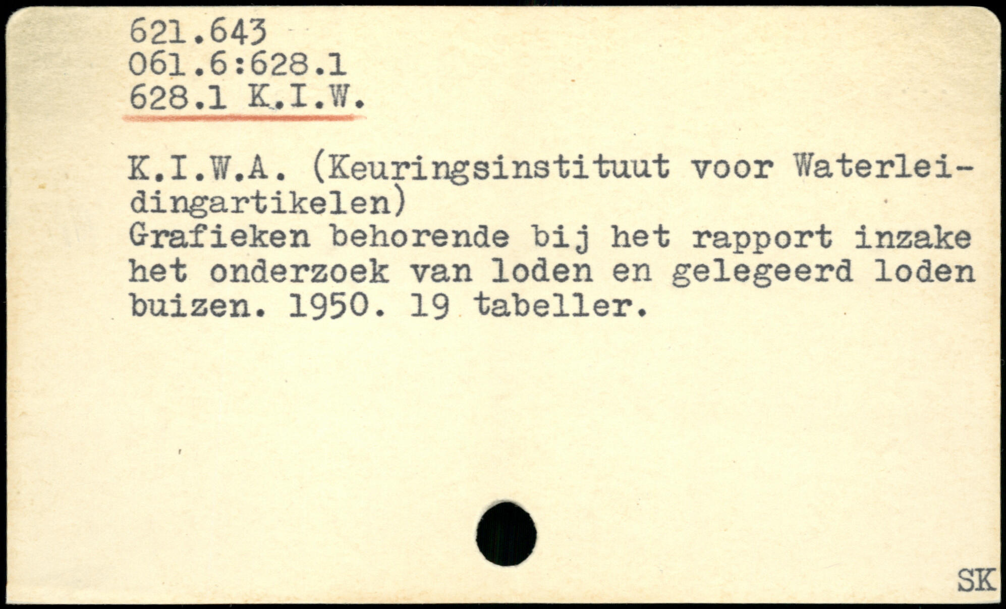 K.I.W.A. (Keuringsinstituut voor Waterleidingart ikelen) Grafieken behorende bij het rapport inzake het onderzoek van loden en gelegeerd loden buizen. 1950. 19 tabeller.