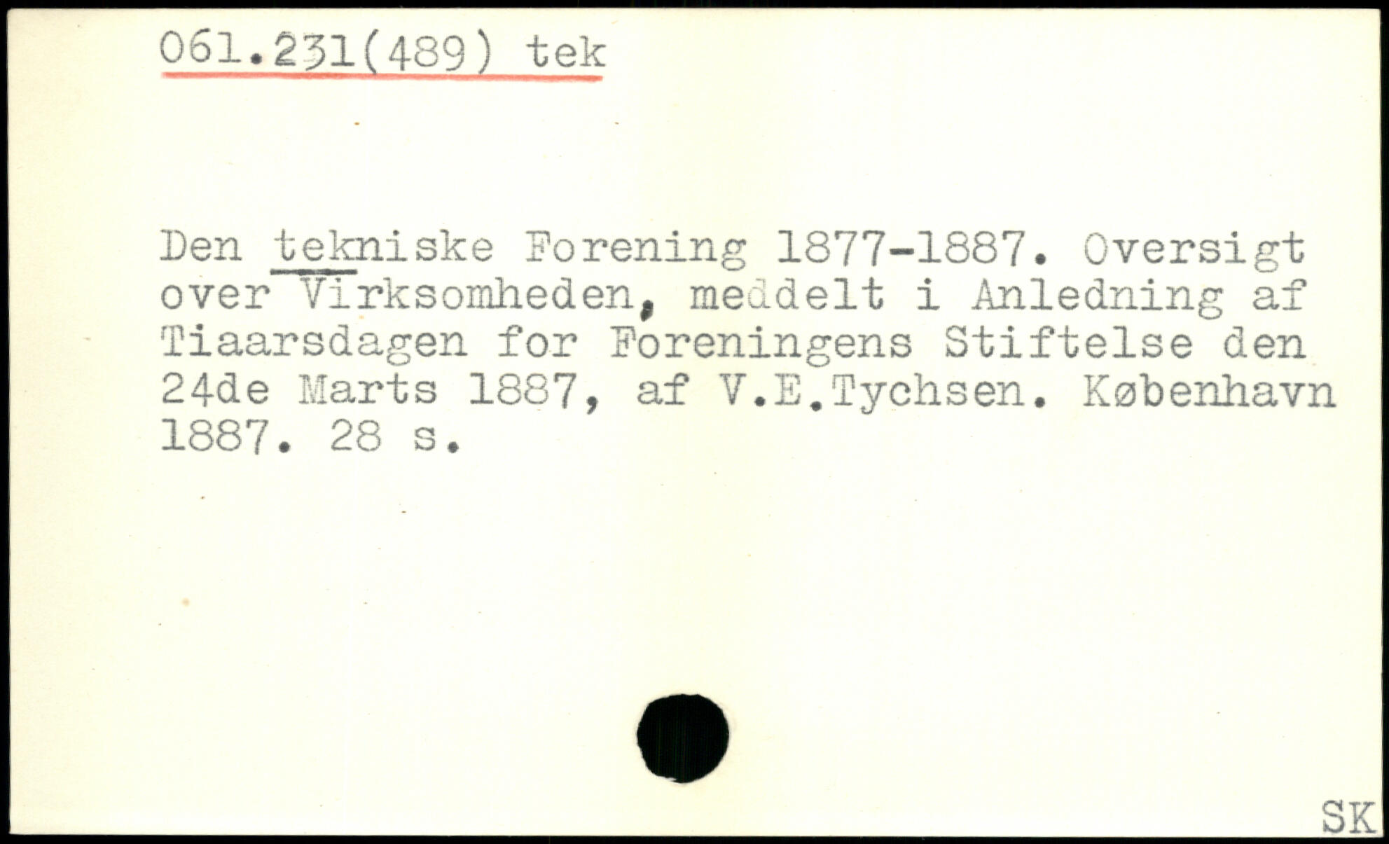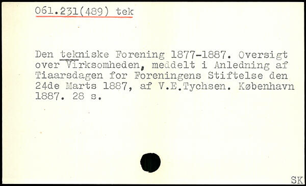 len tekniske Forening 1877-1887. Oversigt over Virksomheden, meddelt i Anledning af Tiaarsdagen for Foreningens Stiftelse den 24de Marts 1887, af V.E.Tychsen.