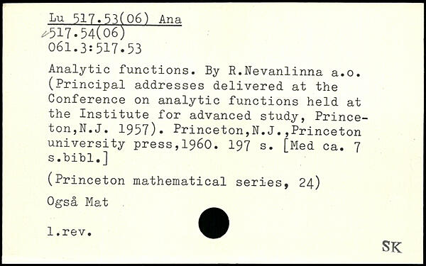 Analytic functions. By R.Nevanlinna a.o. (Principal addresses delivered at the Conference on analytic functions held at the Institute for advanced study, Princeton,N.J. 1957).