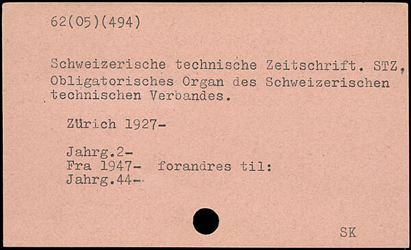 Schweizerische technische Zeitschrift. STZ, Obligatorisches Organ des Schweizerischen technischen Verbandes. Zürich 1927- Jahrg.2- Pra 1947- forandres tiis Jahrg.44-