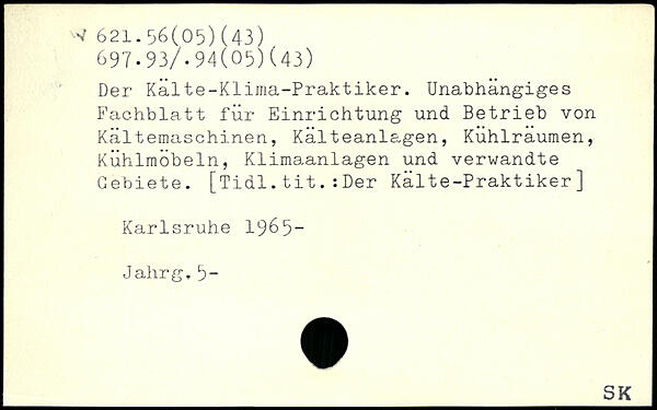Der Kalte-Klima-Praktiker. Unabhängiges Fachblatt für Einrichtung und Betrieb von Kältemaschinen, Kälteanlagen, Kuhlraumen, Kühlmöbeln, Klimaanlagen und verwandte Gebiete. [Tidl.tit.:Der Kälte-Praktiker] Karlsruhe 1965- Jahrg.